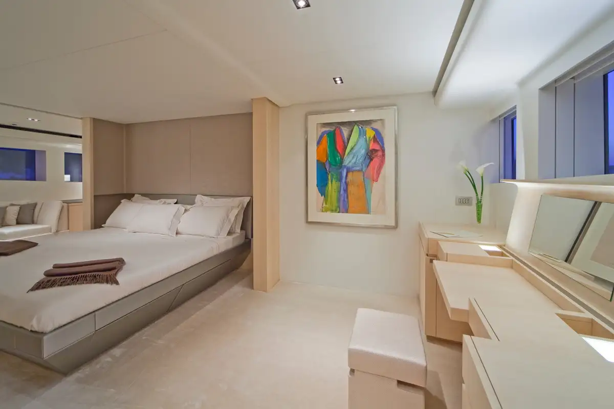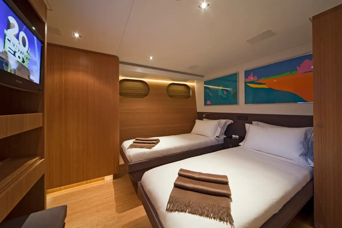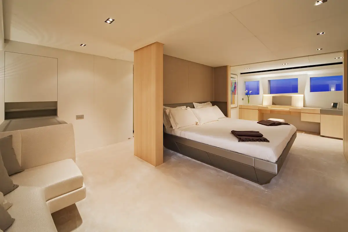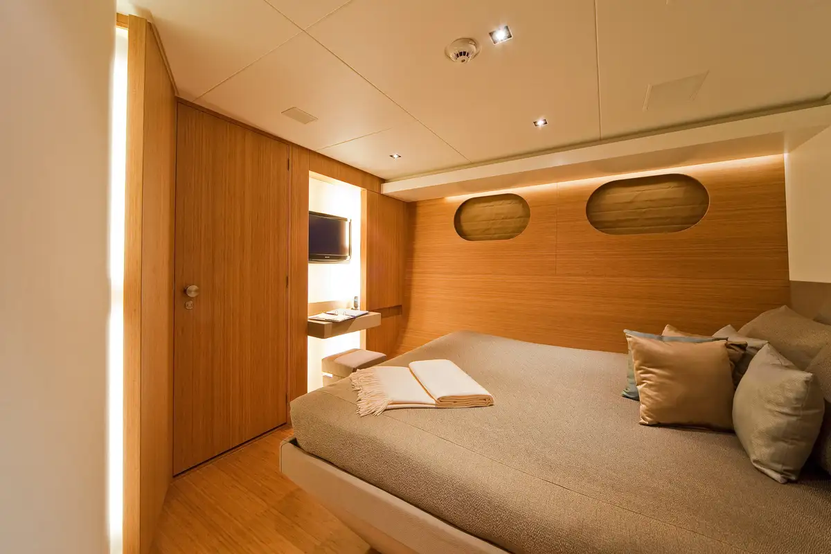 At the forward end of the main deck, with stunning sea views, the full-beam master cabin is a roomy and soothing retreat with private study and lounge areas. The other four cabins are spacious suites in their own right, and two can be converted from doubles to twins.