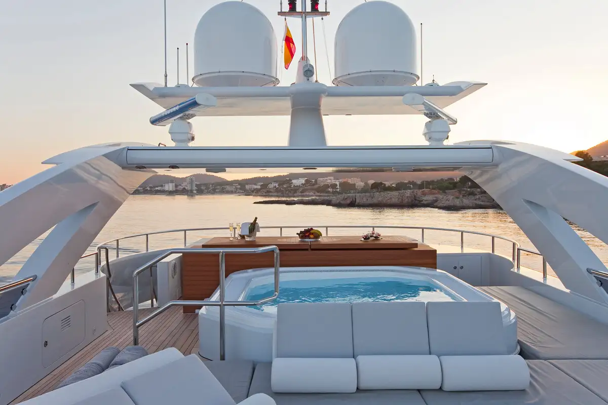 There’s nothing better on a hot, windless day than to ask your captain to open the throttles and make yourself at home in comfortable foredeck lounge as she speeds along the coast with an ice-cold cocktail in your hand, the cooling breeze in your hair and panoramic views of the mountains towering above the Riviera. When the anchor goes down, head up to the sundeck where the barbecue grill is sizzling, slip into the jacuzzi and at the swim-up bar.