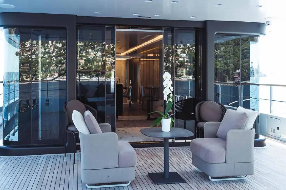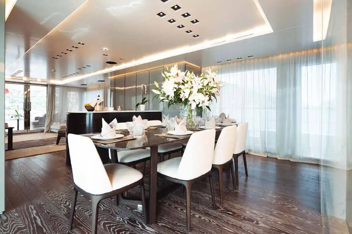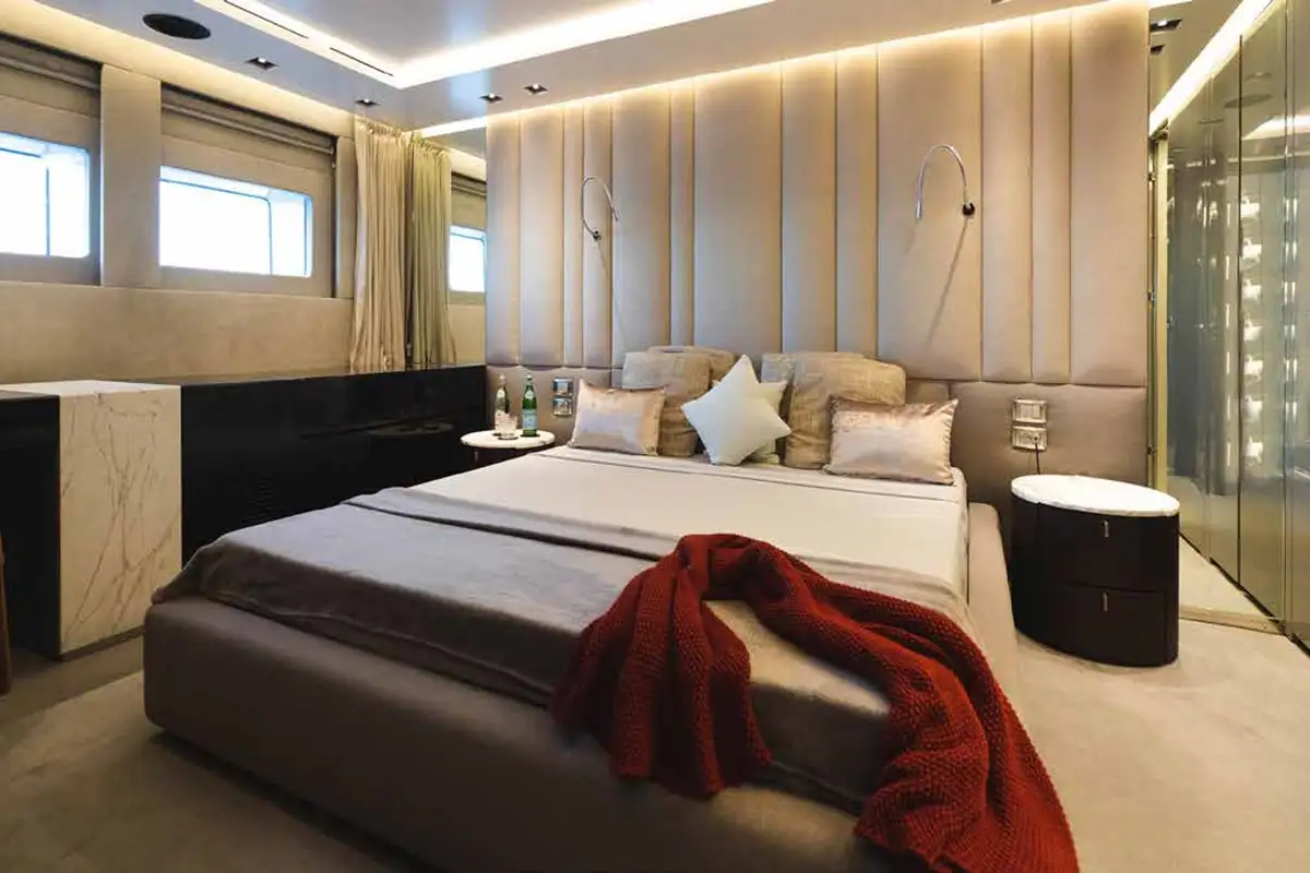 With 299GT of internal volume, she is notably roomy for a yacht of this size and configured to host up to 12 guests with separate quarters for a crew of seven. The interior design scheme by Gian Marco Campanino is minimalist and resolutely modern. The fully glazed main deck saloon is an open plan space with lounge seating aft and formal dining area amidships. The pantry and galley are forward, to port. On the starboard side, a hallway leads forward to the owner’s suite in the bow.