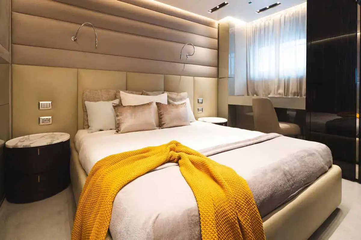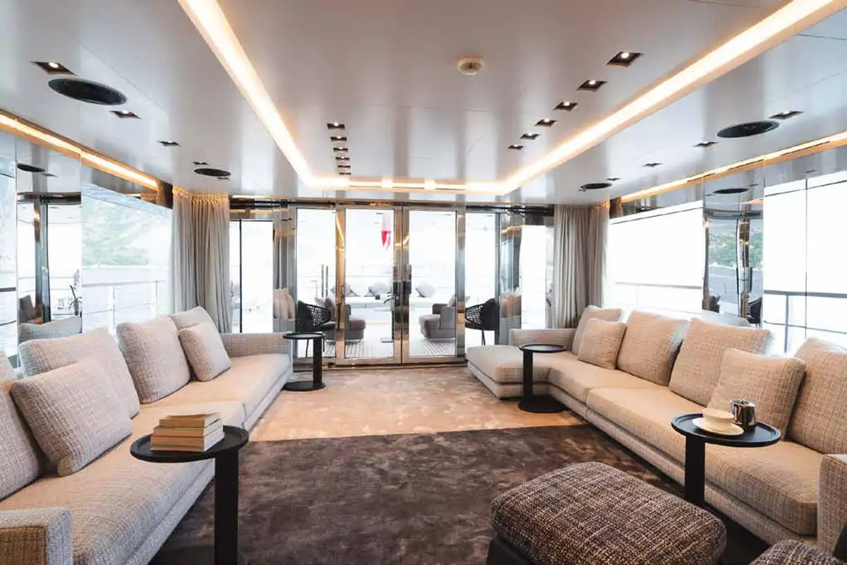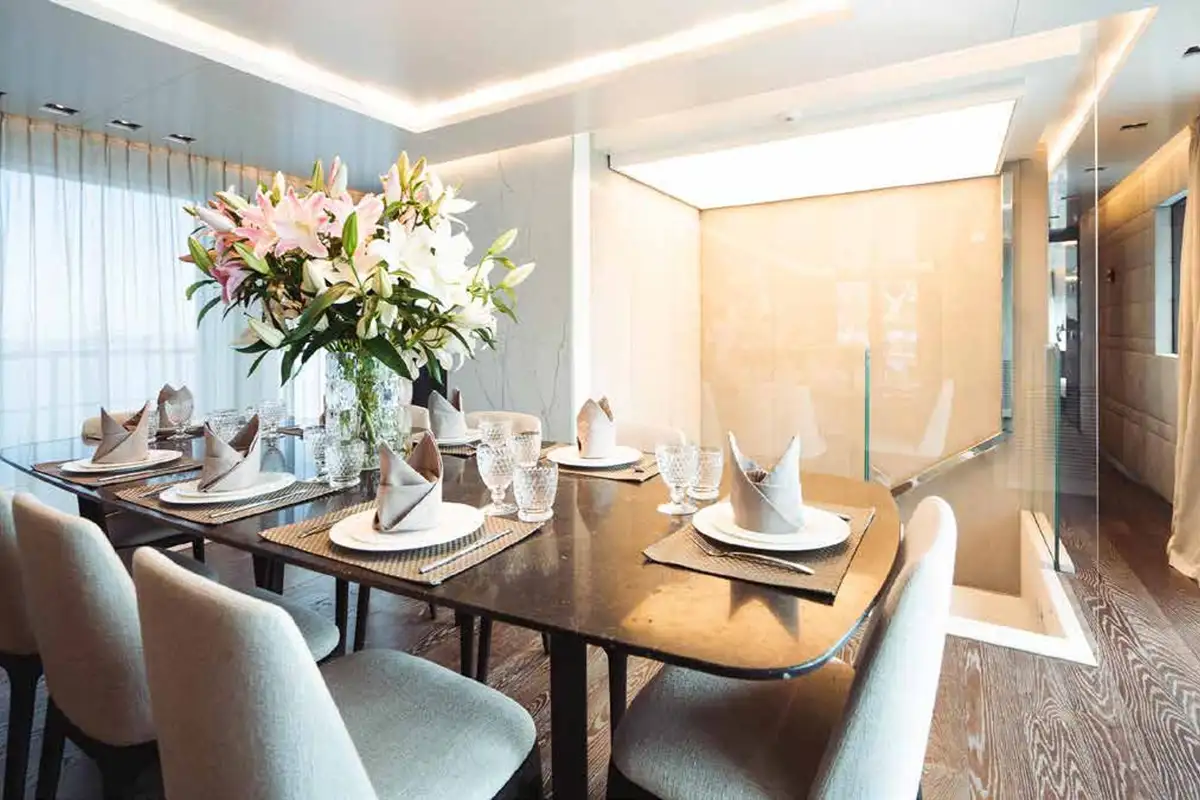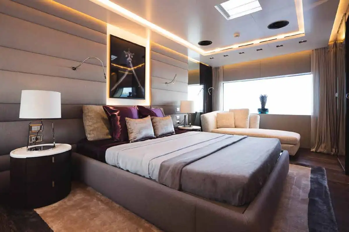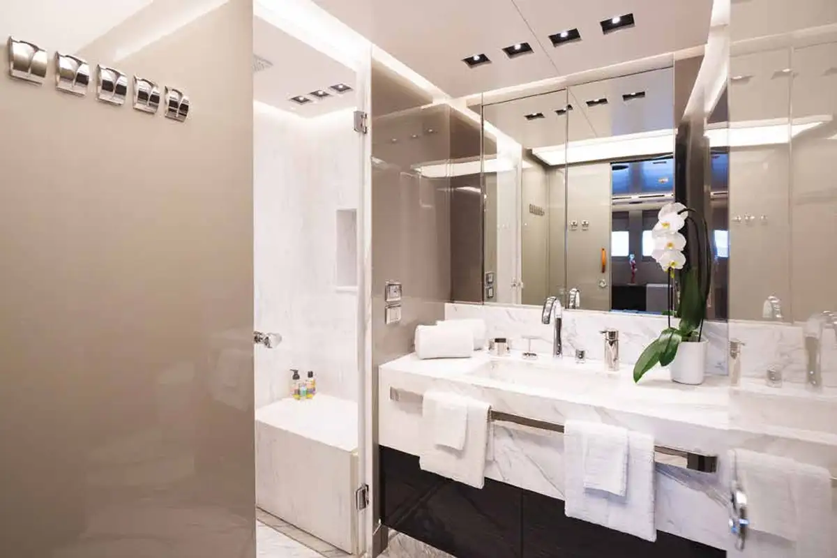 The full beam owner’s suite is L-shaped with excellent views, office and seating areas, large en suite and king sized bed on the centreline. It’s flooded with natural light from skylights above. The other guest cabins are amidships on the lower deck: another luxurious full beam suite, a VIP double and two twin cabins, three of which have extra pullman berths. The crew’s quarters are in the bow.
