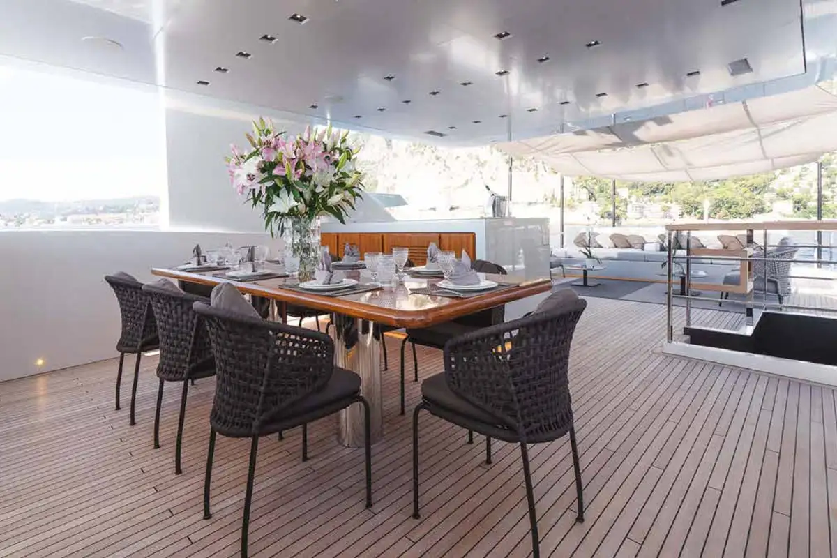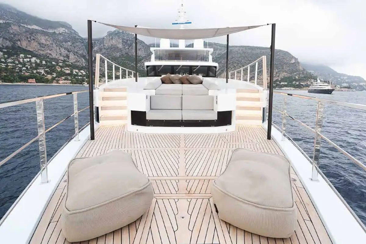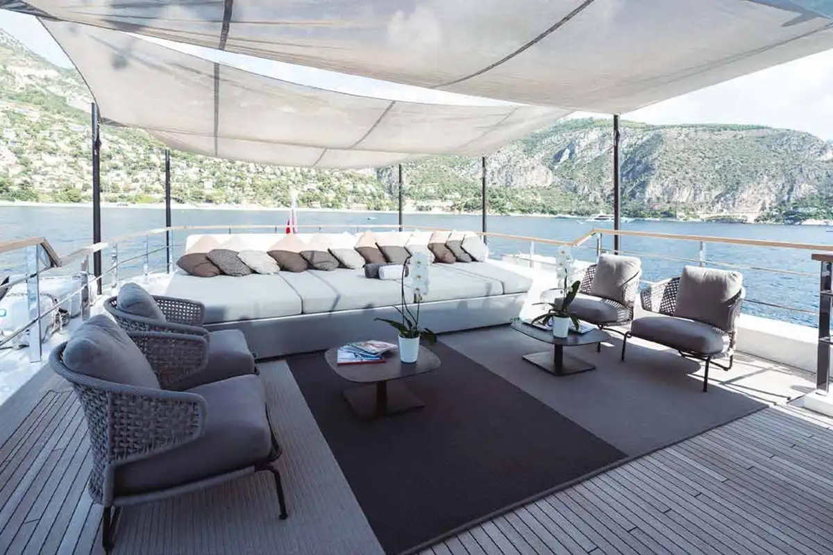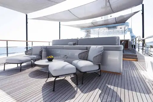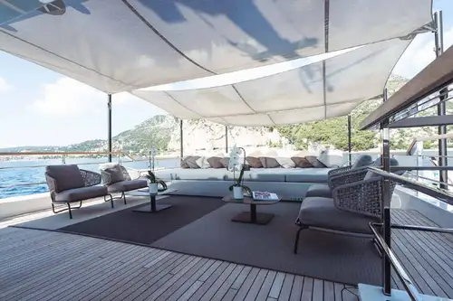 Her innovative exterior design offers plenty of different spaces for guests: cushions on the bow, foredeck seating and a big sunbed with an awning slung on poles for shade, a very spacious sun deck, an elegant aft cockpit with sofas and sunbeds, and a teak-clad beach club with a fold-down swim platform extension in her transom stern.