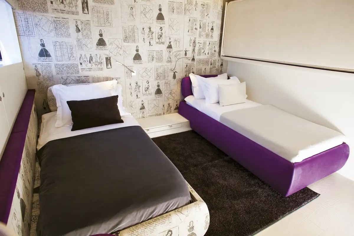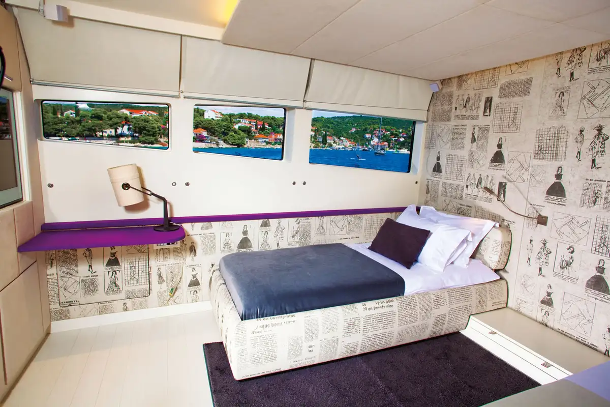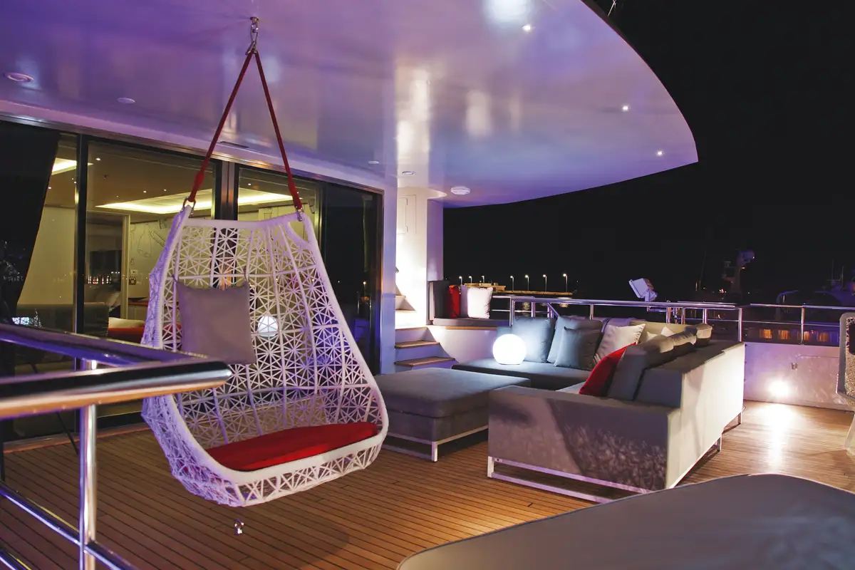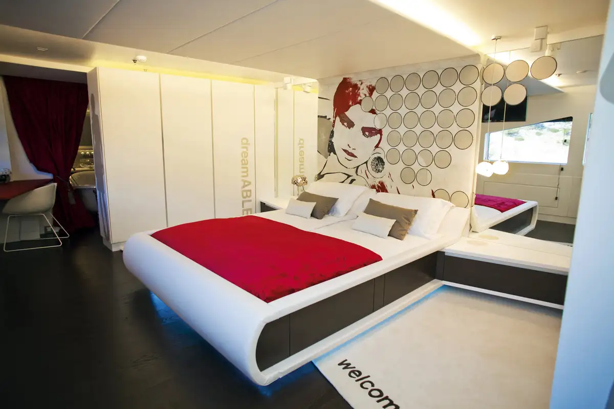 As you might expect, her accommodation is a little quirky too. The master suite faces to port on the bridge deck and has its own private lounge with access to a sun lounge on the aft deck that has a hanging chair and modular furniture.