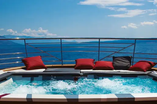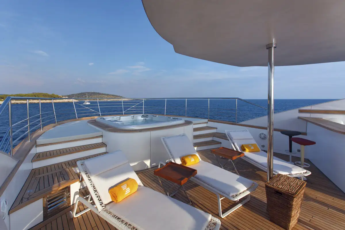 The sun deck is always a great place to be with its large raised jacuzzi surrounded by sun pads forward a bar in the central section and plenty of versatile space elsewhere, including the aft section where the tenders are stowed underway.