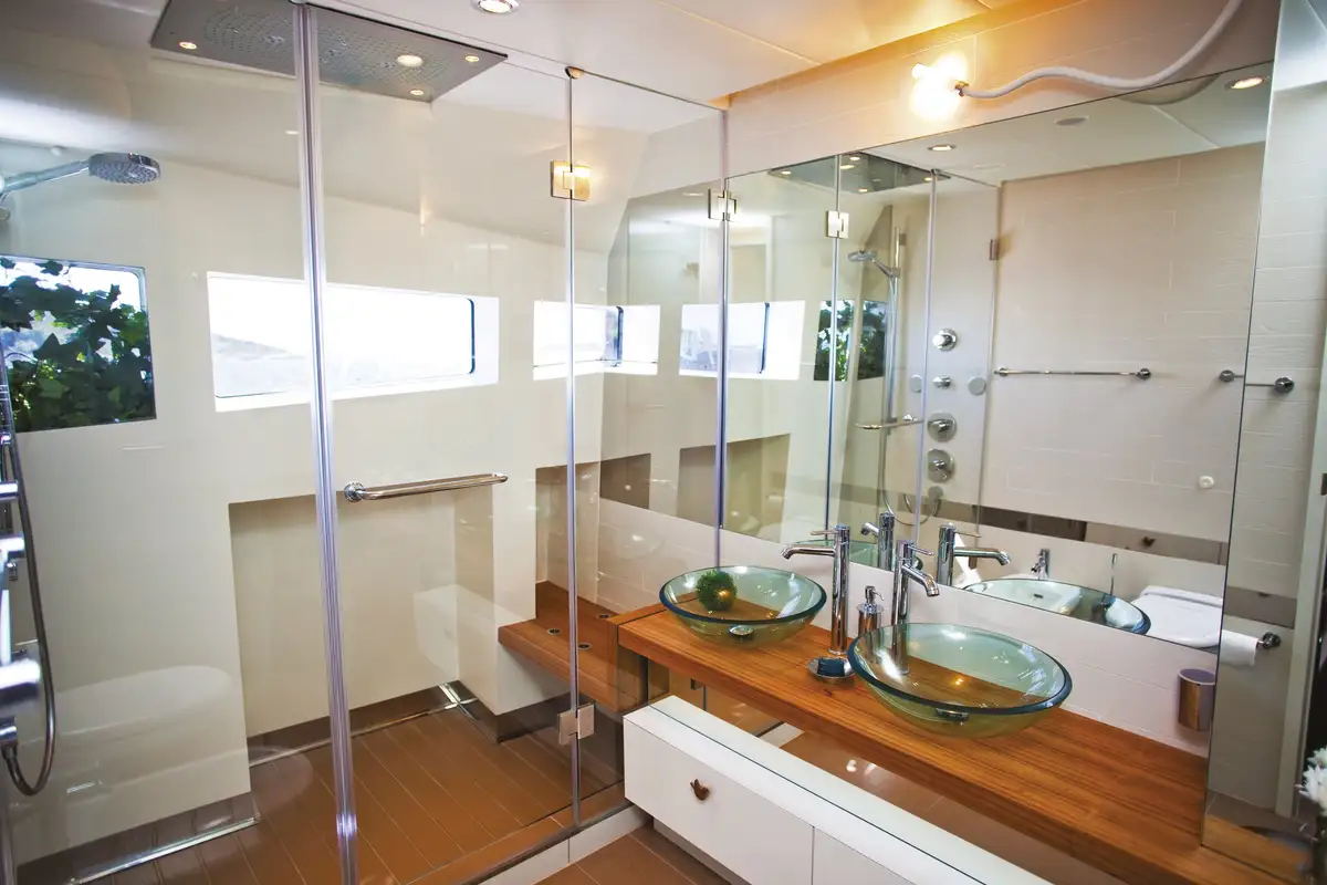 There is also a VIP twin guest suite on the bridge deck with access to a Portuguese bridge lounge and two huge sun pads on the foredeck. The rest of her accommodation, two double suites and two twin suites, is forward on the main deck for convenience, better views, and natural light.