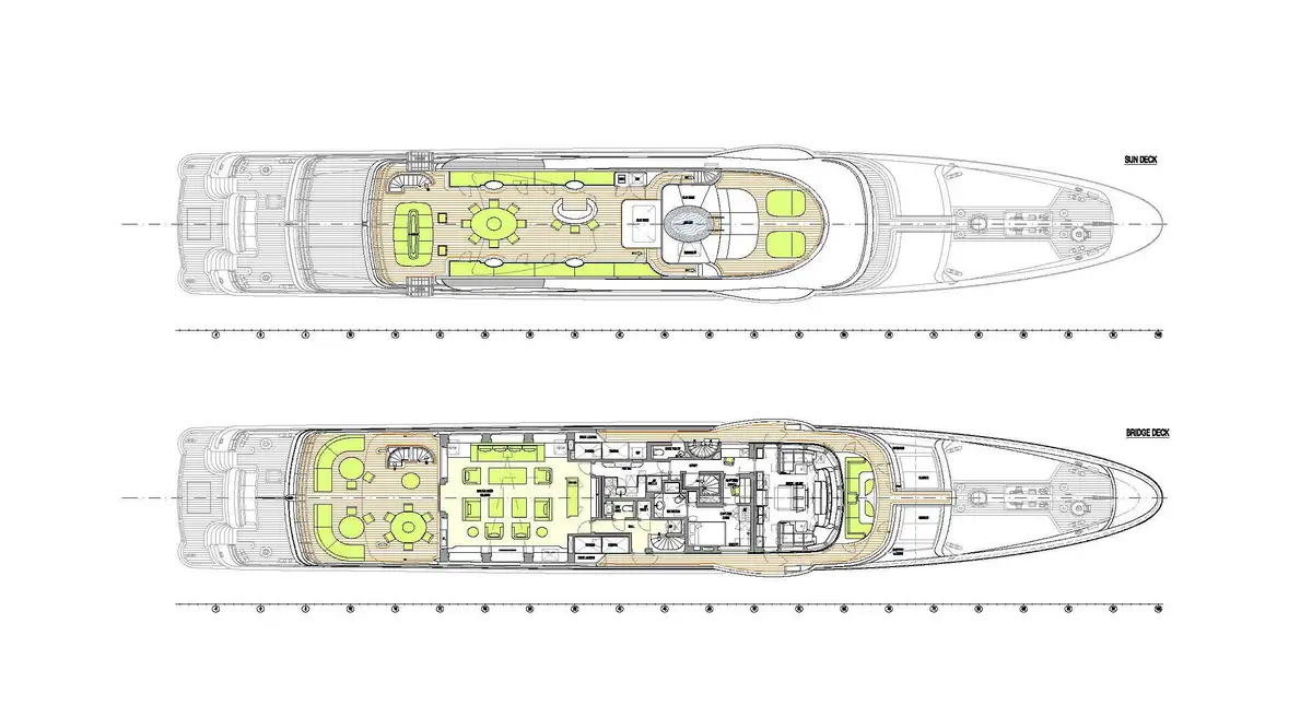 This timeless Tim Heywood exterior design was built with a steel hull and aluminium superstructure. Her vast exterior decks provide entertainment and relaxation for all. The moment you step on board you will notice a large social space on the main deck aft with plush sofas and loungers. An al fresco dining experience can be found on the bridge deck aft with seating for 10 guests. The sun deck highlights the unobstructed panoramic views, with a jacuzzi and touch and go helipad forward.