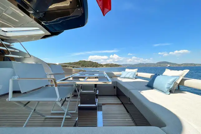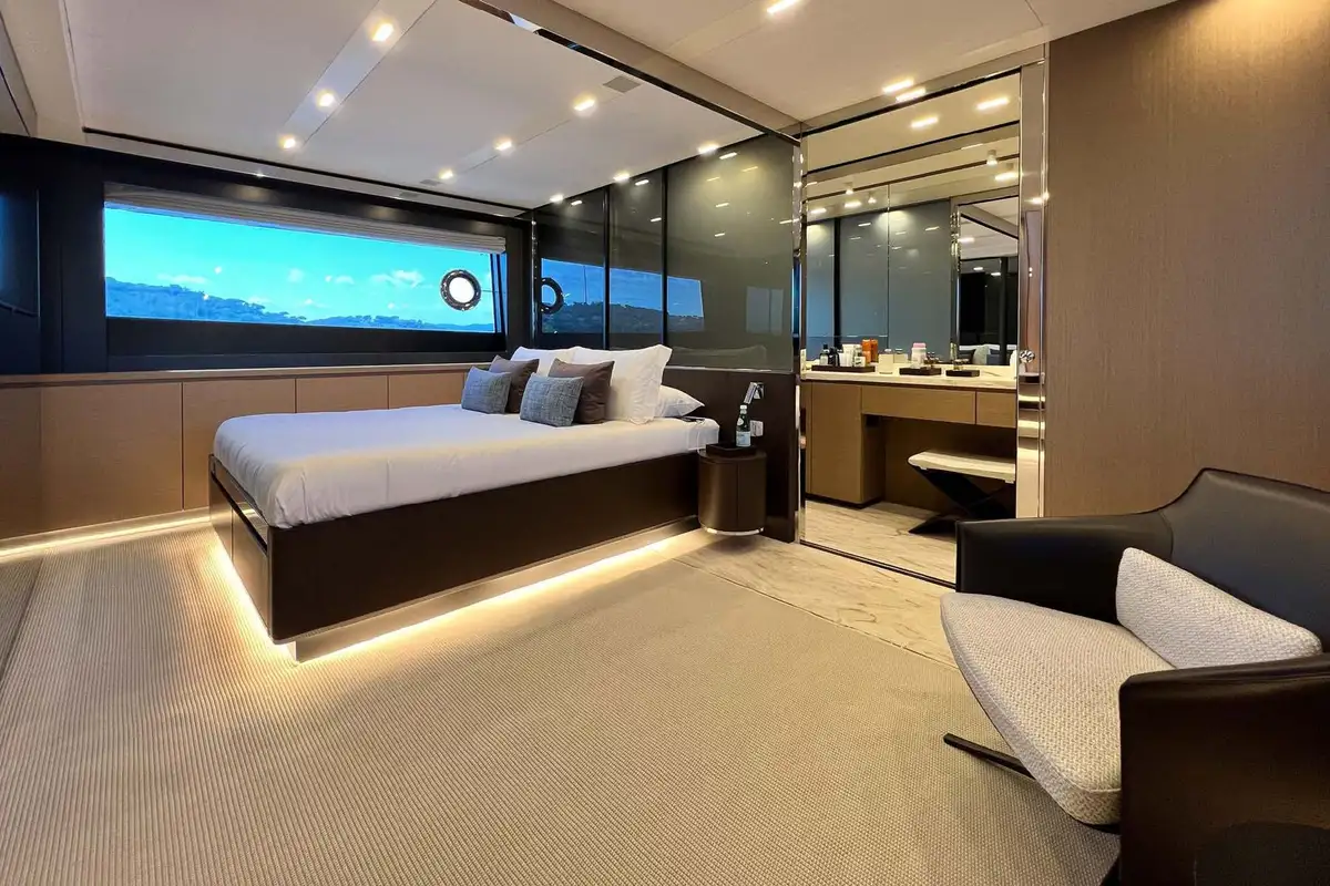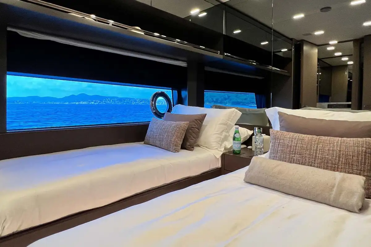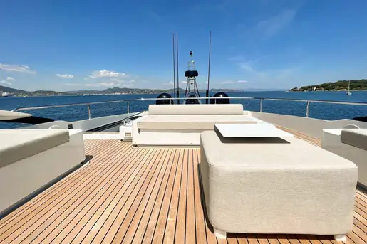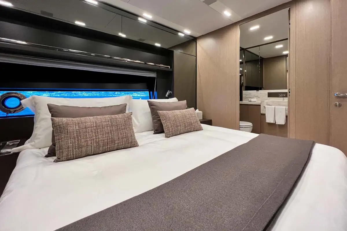 Featuring 4 staterooms on the lower deck, KAR can accommodate up to 8 guests, pampered by a professional crew of four. - The expansive full-beam Owner's suite boasts a king-size bed, a spacious ensuite bathroom spanning the full beam, and a remarkably large walk-in wardrobe. - Two VIP suites forward feature queen-size beds, offering a blend of space, light decor, and comfortable amenities, complete with ensuite bathrooms and wardrobes. - The Twin guest cabin is equally spacious, featuring an ensuite bathroom and wardrobe. On the lower deck, the well-appointed galley is conveniently situated next to the crew mess and sleeping area.As a "sporty" flybridge yacht, KAR's deck space is utilized to perfection, including a delightful aft deck dining area with seating for 8 with a bimini, expansive seating and lounging areas on the flybridge, and additional space on the foredeck.
