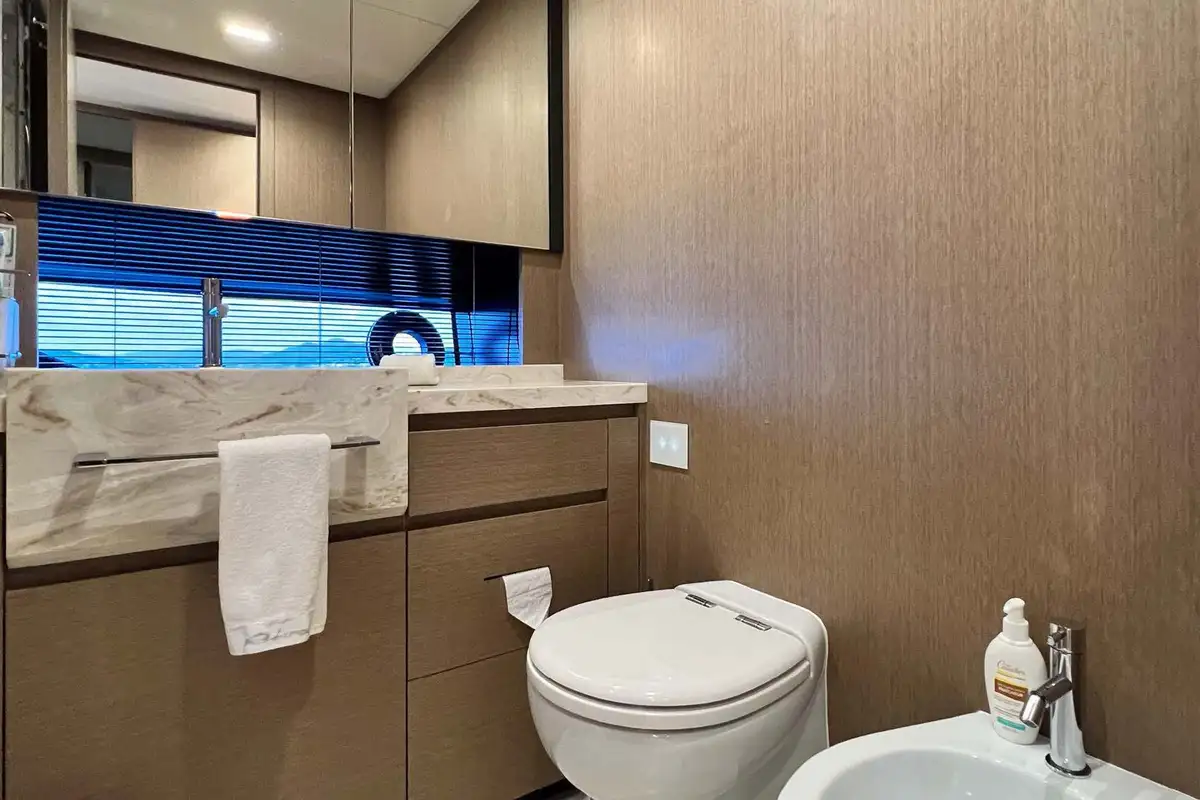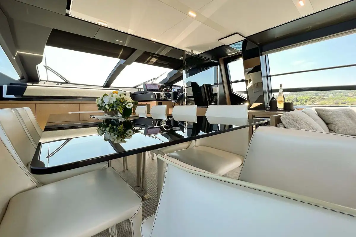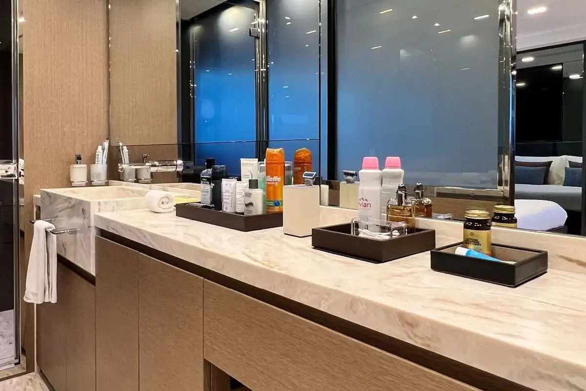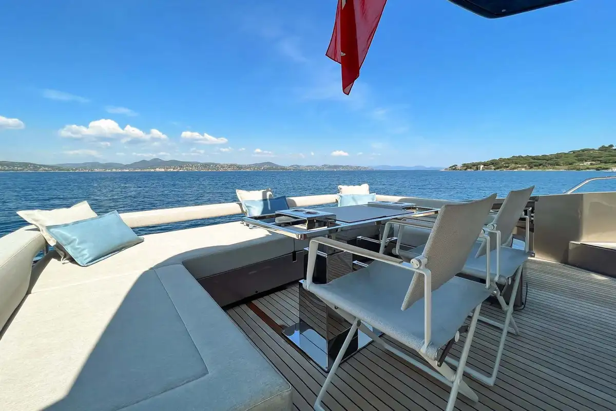 Featuring 4 staterooms on the lower deck, KAR can accommodate up to 8 guests, pampered by a professional crew of four. - The expansive full-beam Owner's suite boasts a king-size bed, a spacious ensuite bathroom spanning the full beam, and a remarkably large walk-in wardrobe. - Two VIP suites forward feature queen-size beds, offering a blend of space, light decor, and comfortable amenities, complete with ensuite bathrooms and wardrobes. - The Twin guest cabin is equally spacious, featuring an ensuite bathroom and wardrobe. On the lower deck, the well-appointed galley is conveniently situated next to the crew mess and sleeping area.As a "sporty" flybridge yacht, KAR's deck space is utilized to perfection, including a delightful aft deck dining area with seating for 8 with a bimini, expansive seating and lounging areas on the flybridge, and additional space on the foredeck.