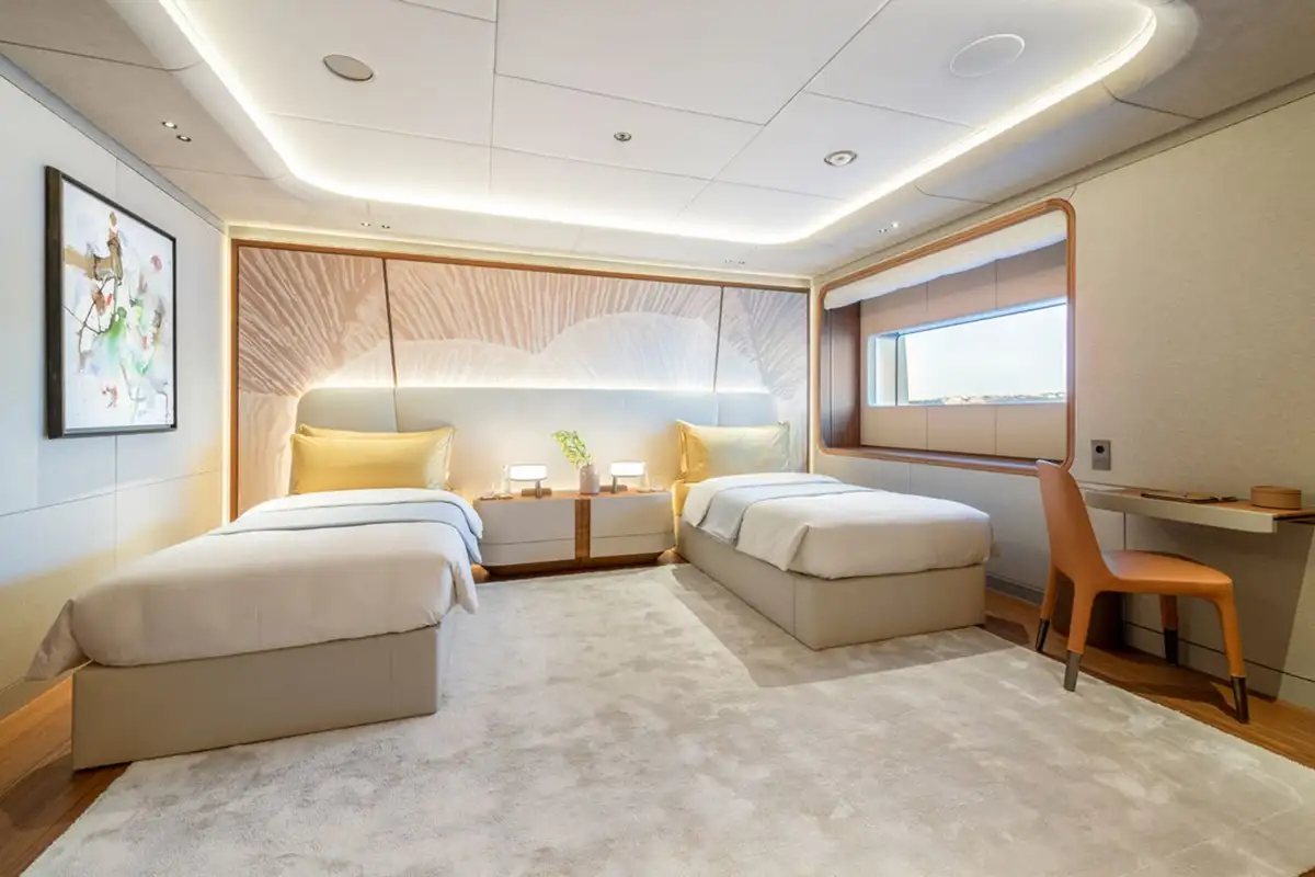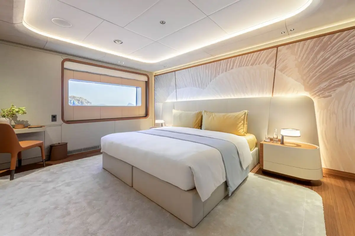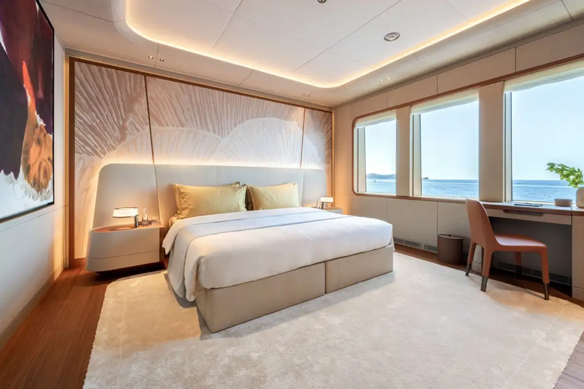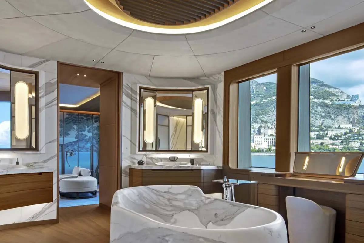 The owner’s suite is simply sublime, with four large rooms that occupy the front half of the main deck. The master cabin flows into a big private lounge, which in turn leads into a dressing room and study. Another door from the cabin leads into a huge en suite bathroom with a free-standing bathtub as its central hub. Come on board and prepare to be amazed.