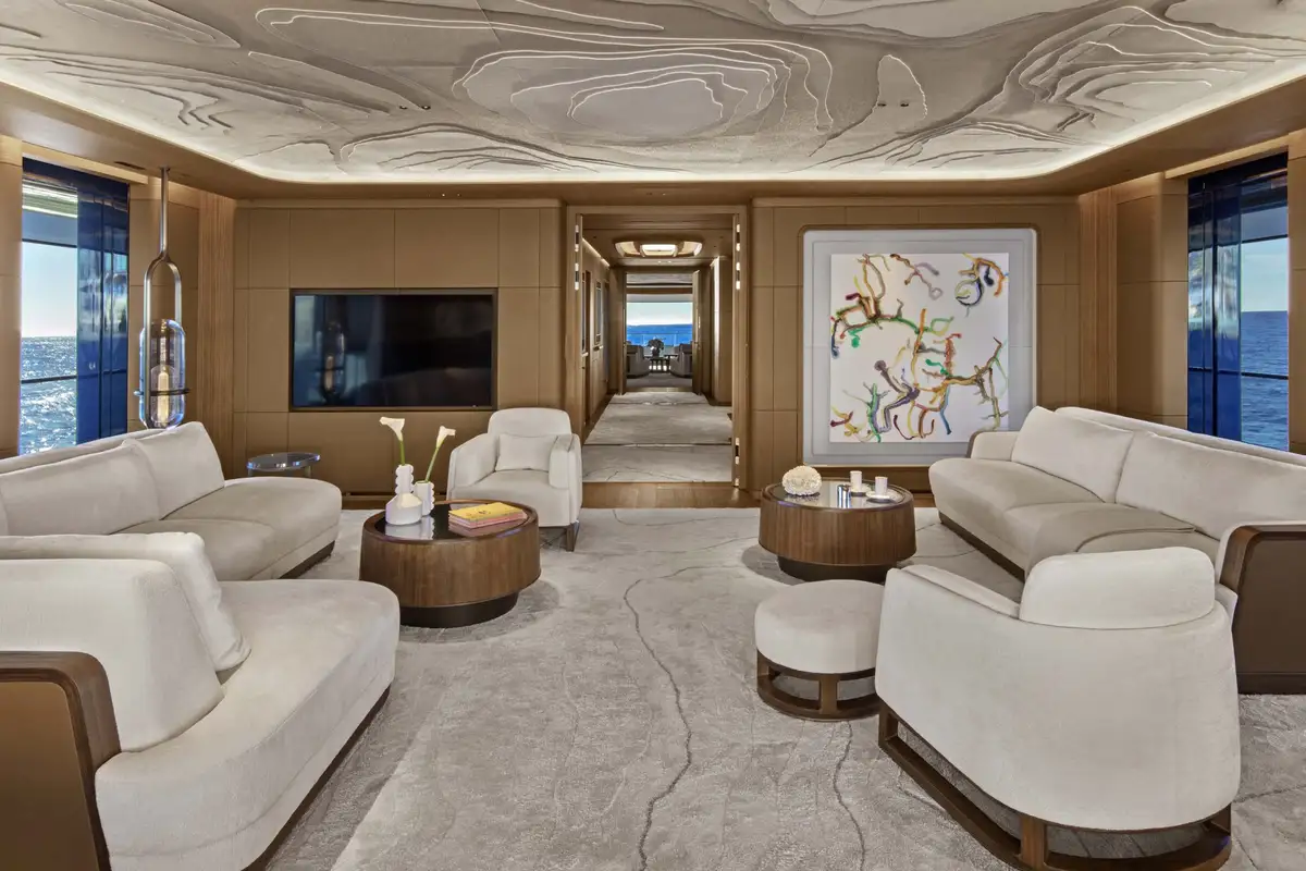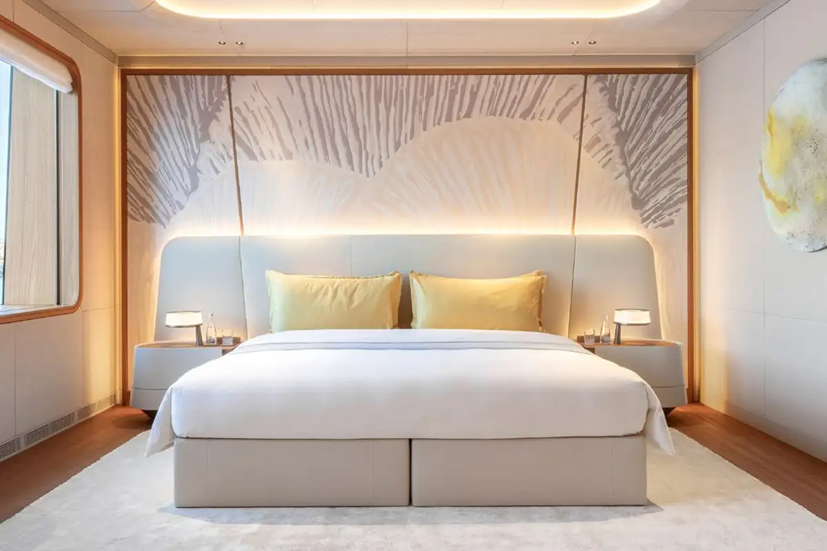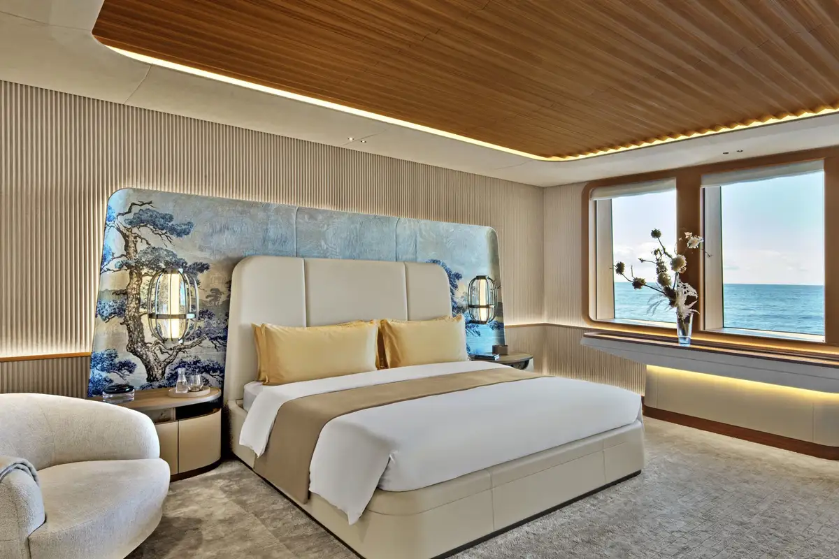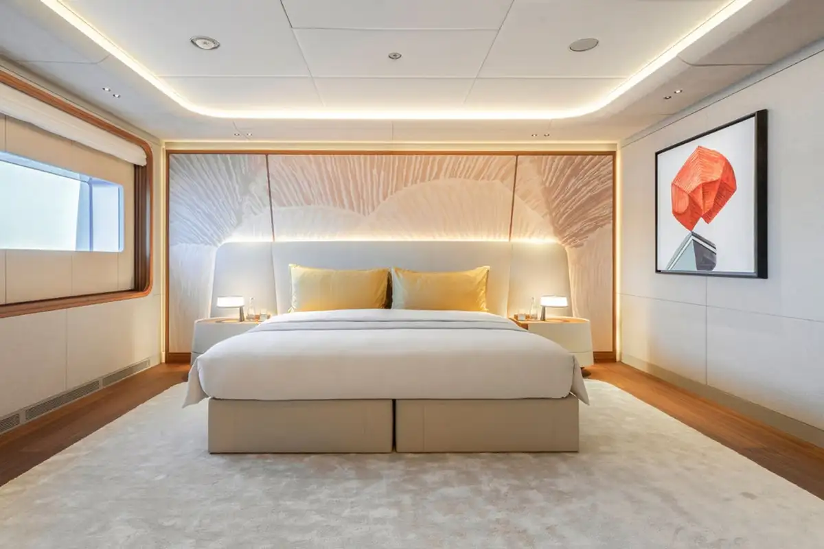 The owner’s suite is simply sublime, with four large rooms that occupy the front half of the main deck. The master cabin flows into a big private lounge, which in turn leads into a dressing room and study. Another door from the cabin leads into a huge en suite bathroom with a free-standing bathtub as its central hub. Come on board and prepare to be amazed.