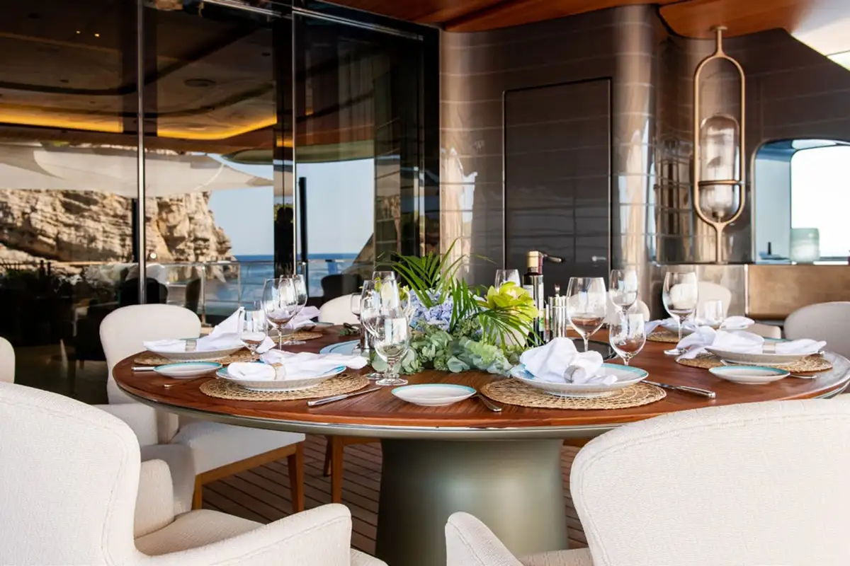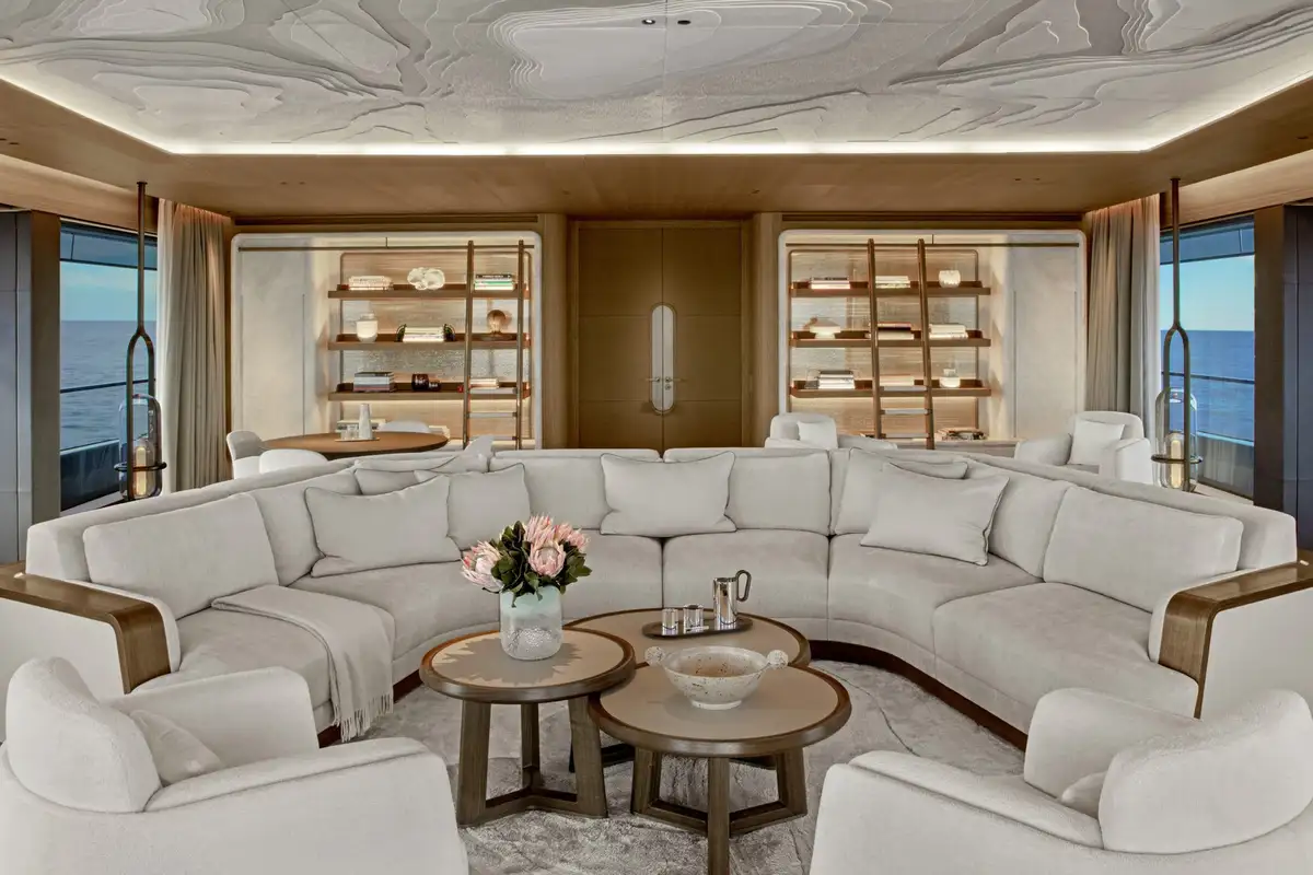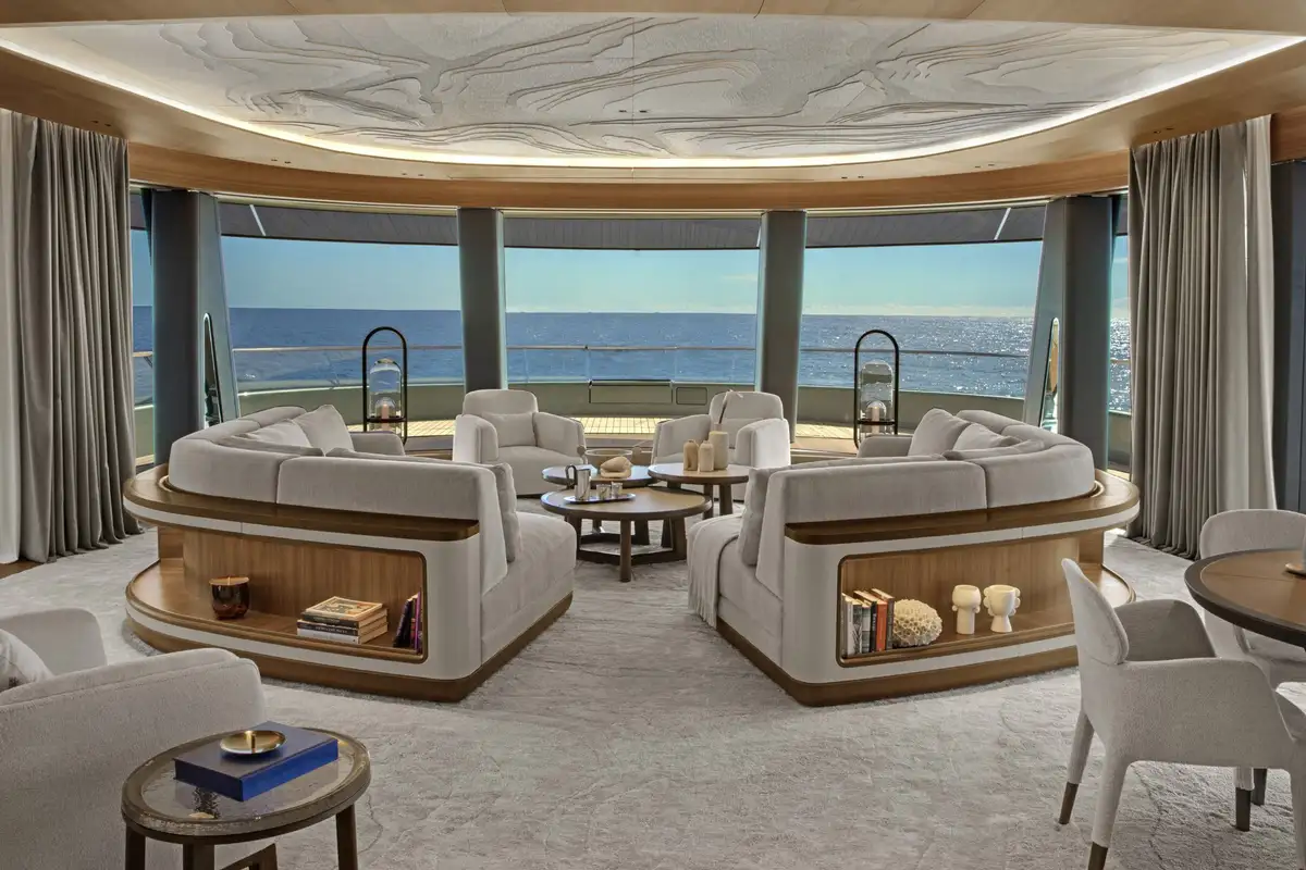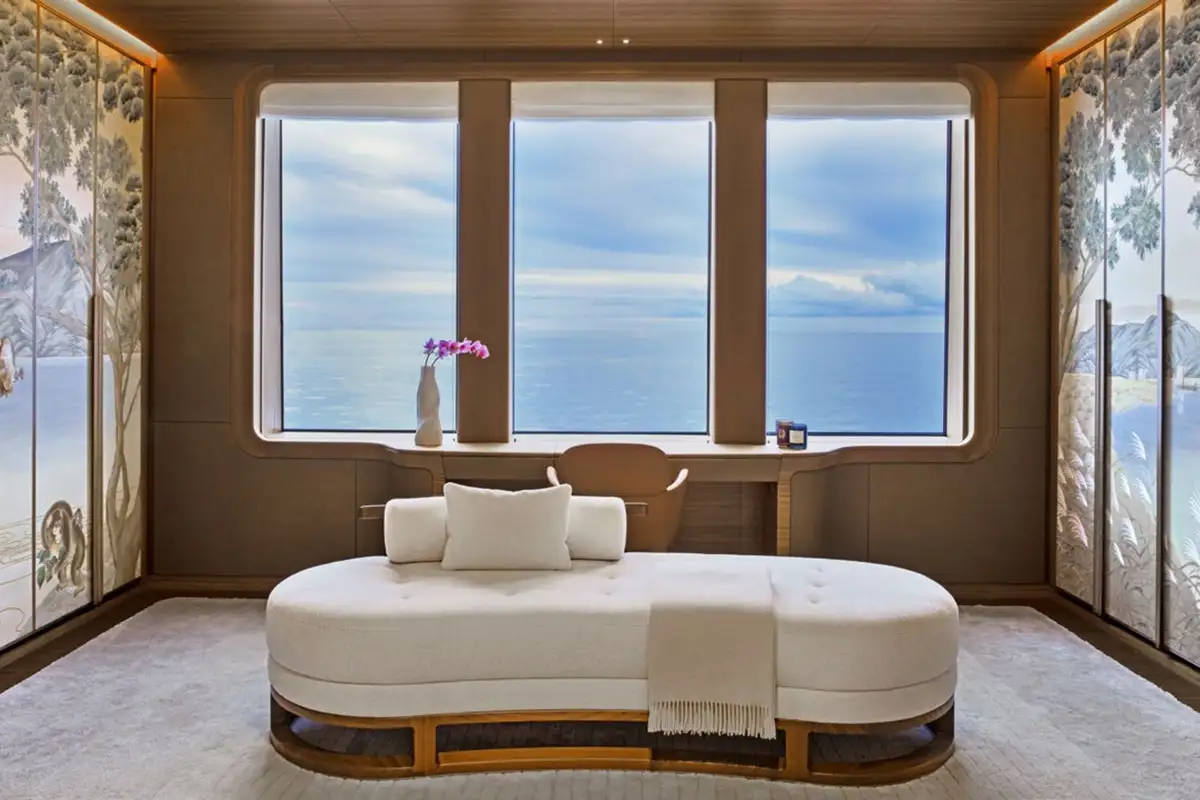 One of the stand-out spaces on board is the main saloon – located on the upper deck – with floor-to-ceiling windows. It’s divided by a broad walkway into two halves: an aft-facing, sociable lounge that spills out onto the upper aft deck, and a forward-facing observation lounge with a spectacular 180° sweep of glass. The dining room is equally impressive with twin six-seat tables beneath an immense chandelier and display cases of rare sea life artefacts.