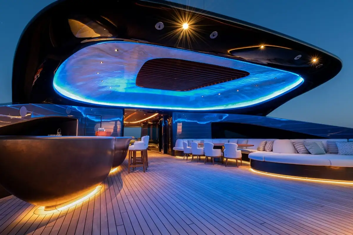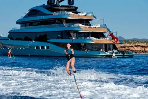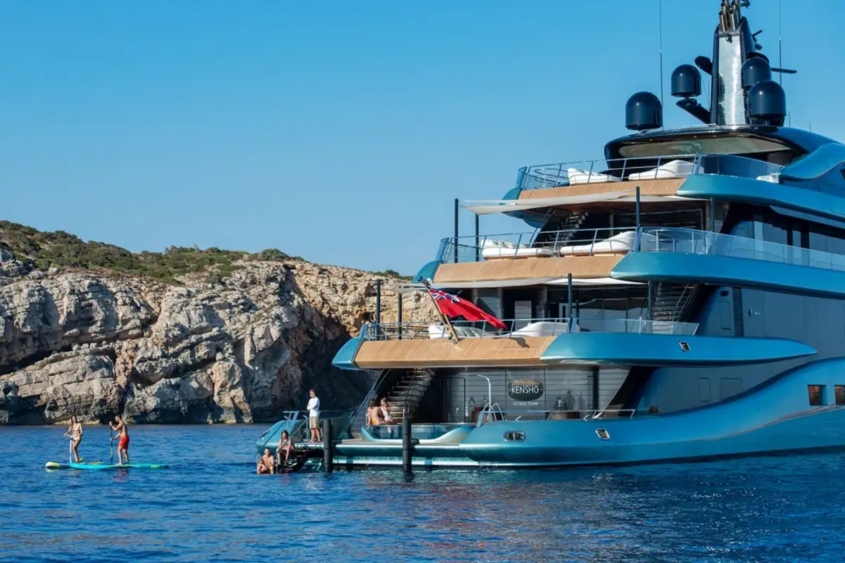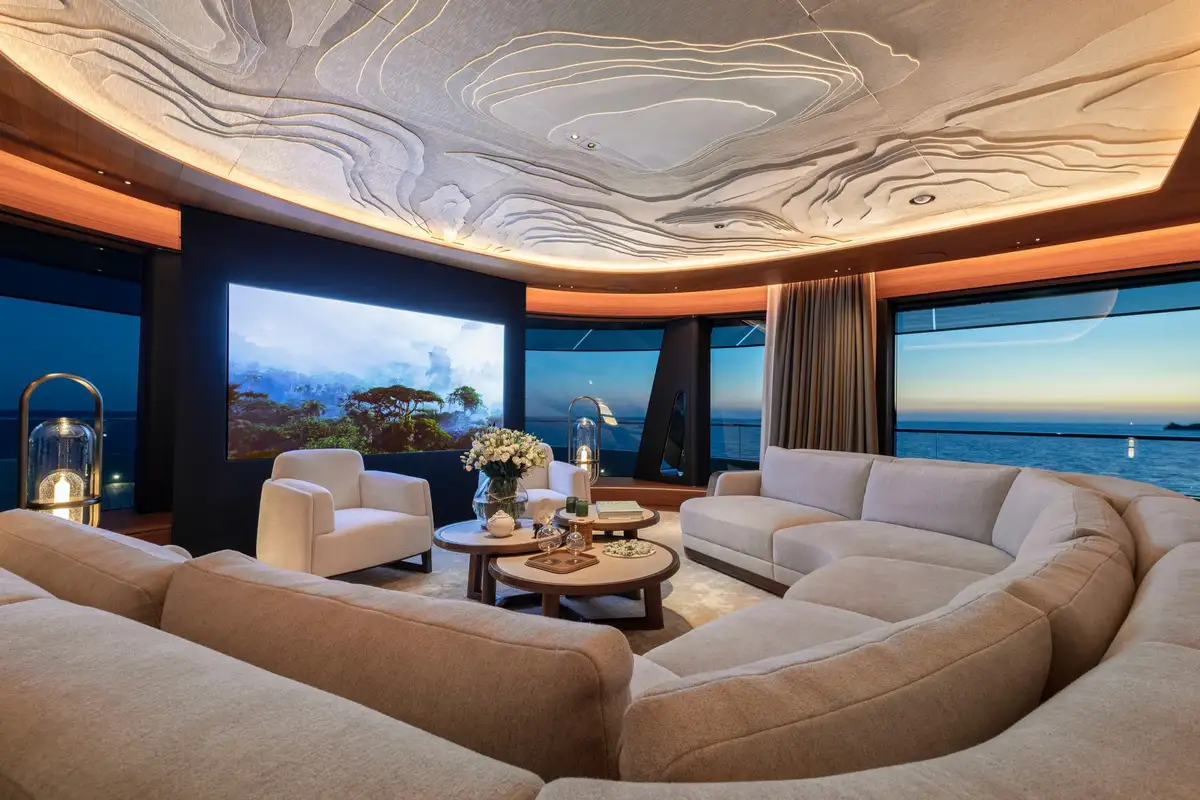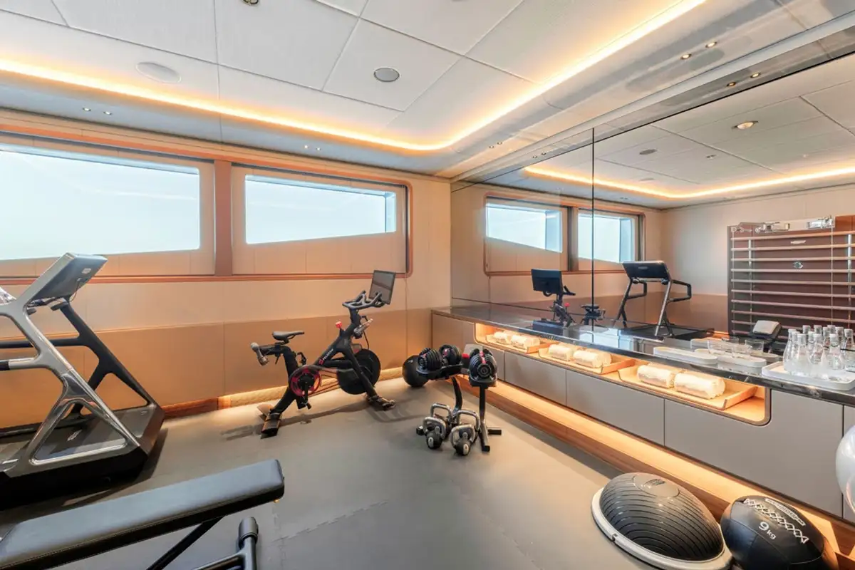 The sun deck has a glass-fronted jacuzzi facing forward with a commanding vantage point over the sea and ample shade from the hardtop above. It’s a perfect place to relax, watching the coast slip by. There’s an enclosed lounge up here too, which transforms into a cinema and a well-shaded living and dining area facing aft, with incredible night lighting. Another great feature is the swimming pool, almost at sea level, next to the bathing platform on the lower deck. There’s also a dedicated, well-equipped gym and KENSHO is an RYA-approved watersports centre with jet skis, e-foil boards, e-bikes and more.