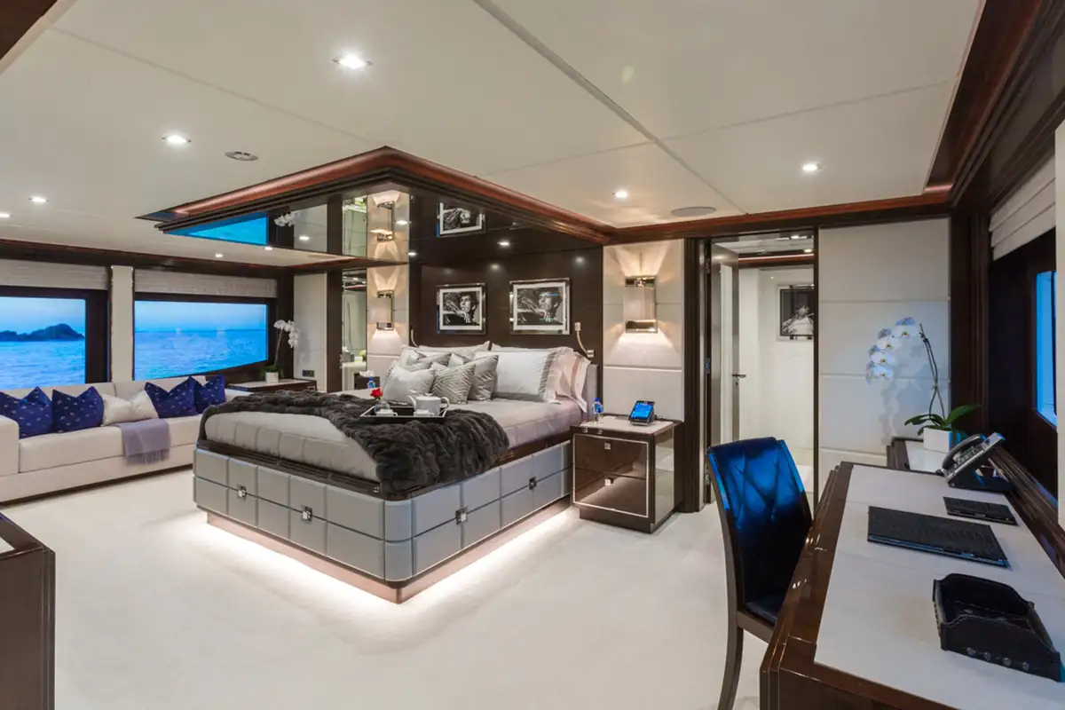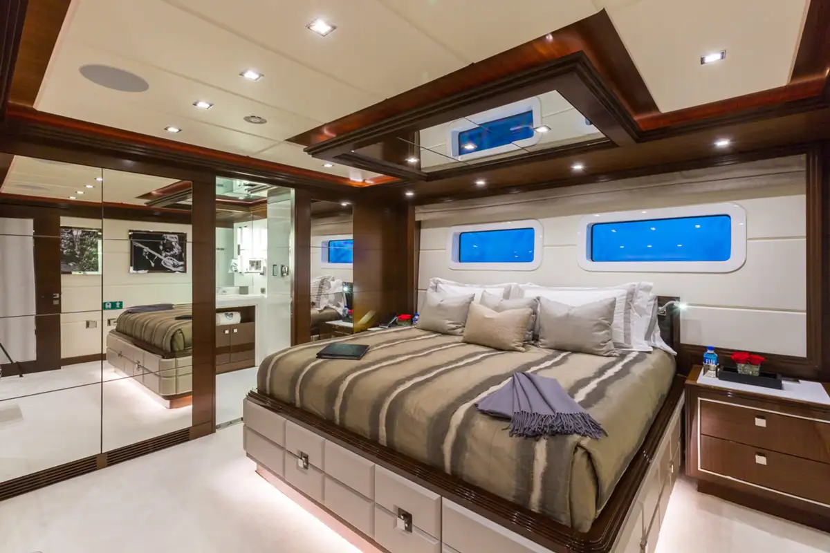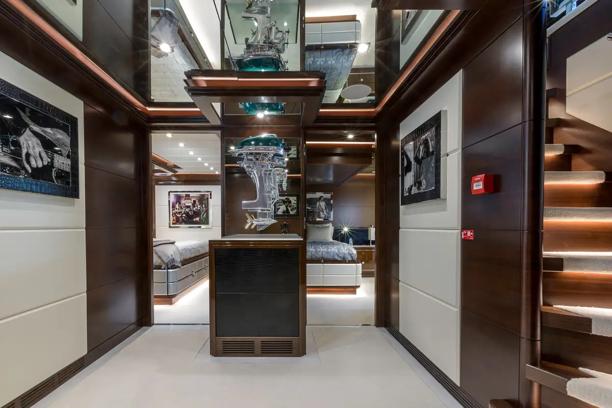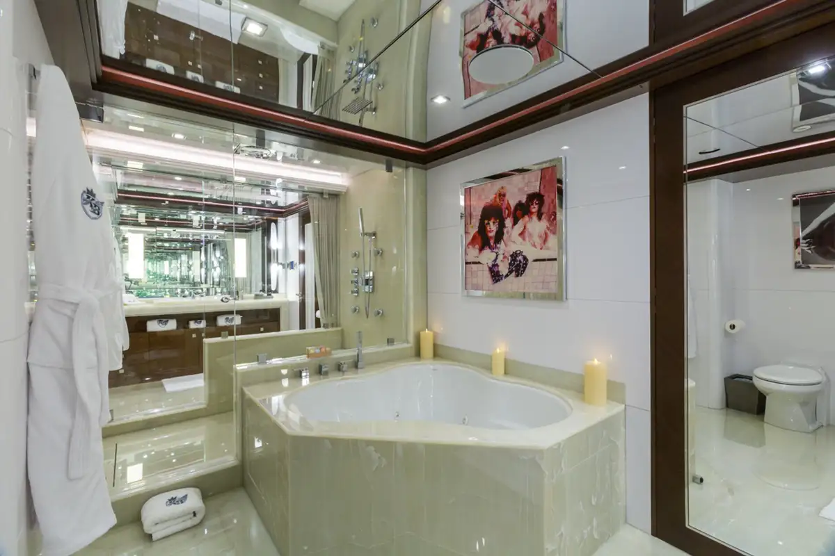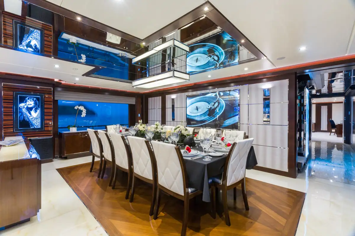 Her sundeck is a spectacular outdoor party zone. The jacuzzi has a three-tier cascading waterfall and a swim-up bar; there’s also a big dining table, a large onyx sit-up bar, sun loungers and sunpads, three TVs and two lounge areas. In the heat of the midday sun, there’s an exhilarating three-storey water slide so you can launch yourself from the sundeck straight into the sea for a refreshing dip.