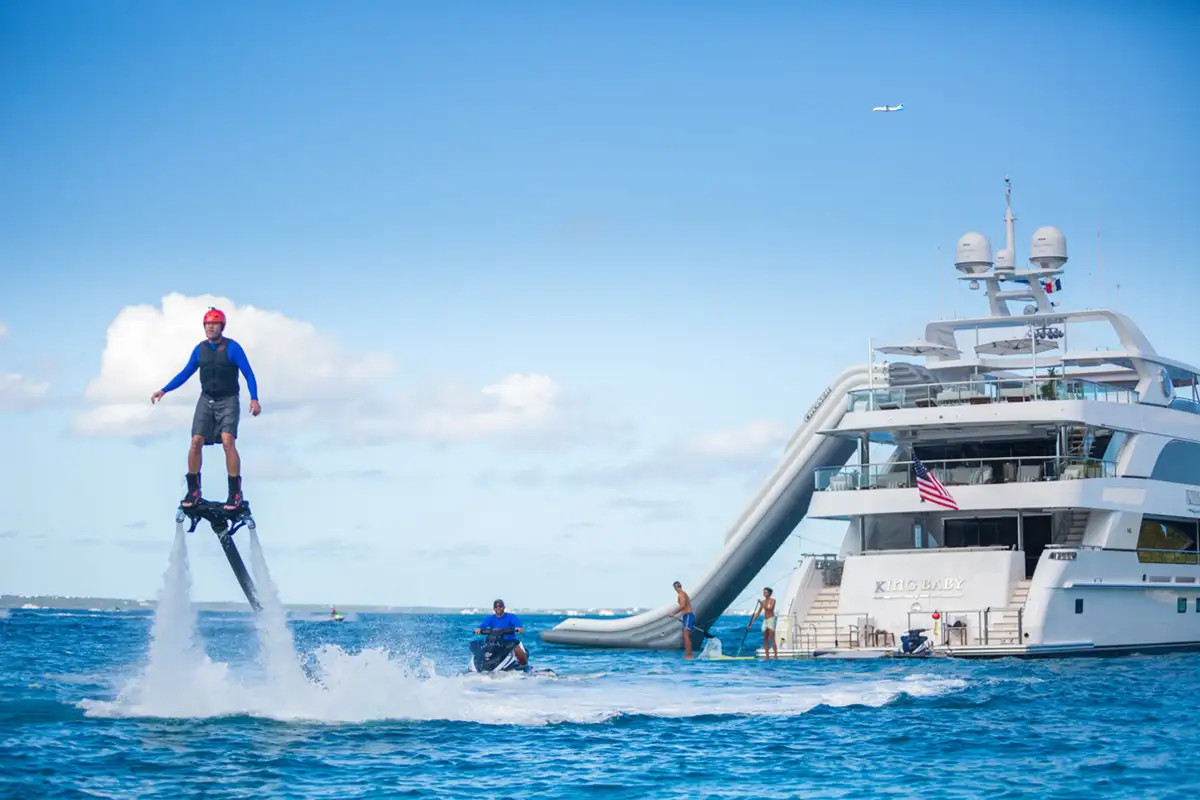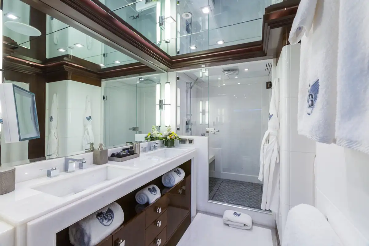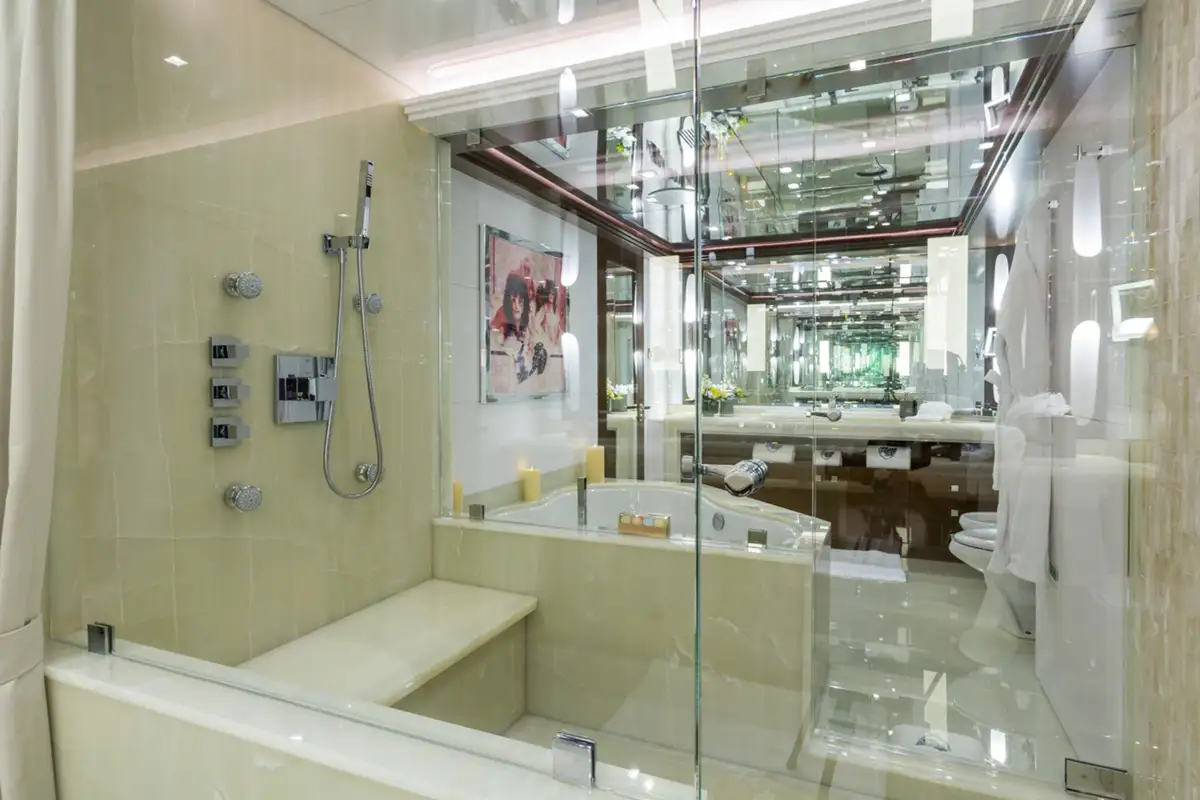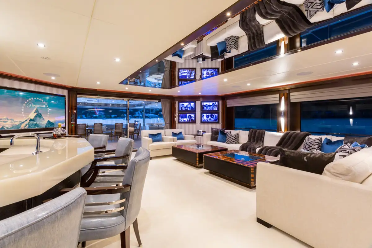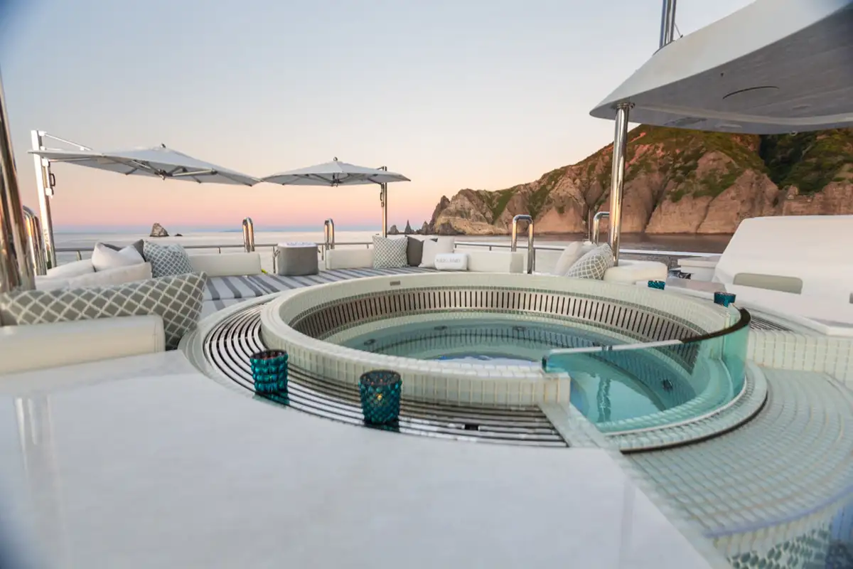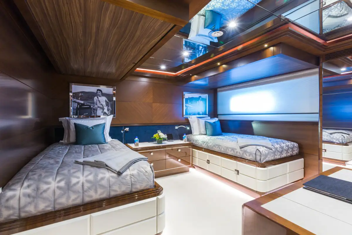 Her sundeck is a spectacular outdoor party zone. The jacuzzi has a three-tier cascading waterfall and a swim-up bar; there’s also a big dining table, a large onyx sit-up bar, sun loungers and sunpads, three TVs and two lounge areas. In the heat of the midday sun, there’s an exhilarating three-storey water slide so you can launch yourself from the sundeck straight into the sea for a refreshing dip.