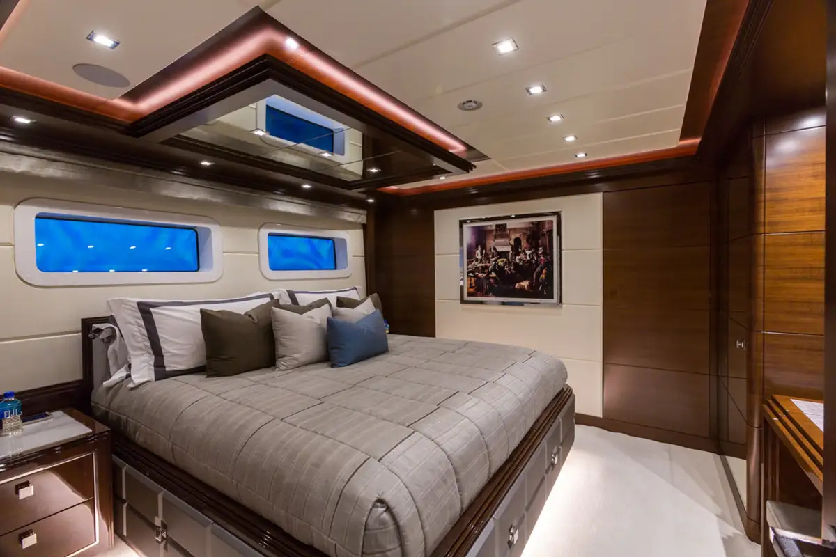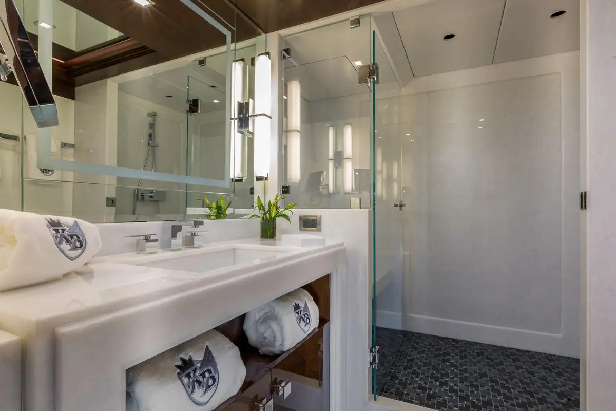 KING BABY’s interior spaces are alluring, inspiring and supremely comfortable, with large saloons on two levels, audiophile entertainment systems and sharp modern décor to perfectly match the unique rock-inspired décor. Up front on the main deck, the master suite is a spacious full-beam cabin with a big, plush sofa, a study desk, king size bed and a two-person bath as well as a rain room shower in the marble en suite bathroom. The other four cabins – three doubles and a twin, on the lower deck – are all nicely finished in the same signature style.