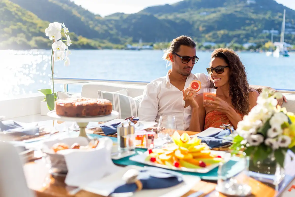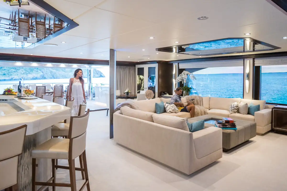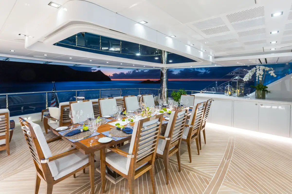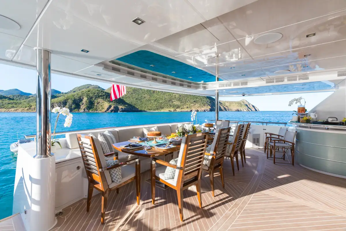 She also has two aft-facing decks, each with a covered dining area and a variety of seating spaces, so when you fancy a different vibe or scene you can simply go to a different deck. The foredeck lounge is yet another inviting option where you can sit and strum a guitar in the cool sea breeze or recline with a book or magazine on the expansive sunpads.