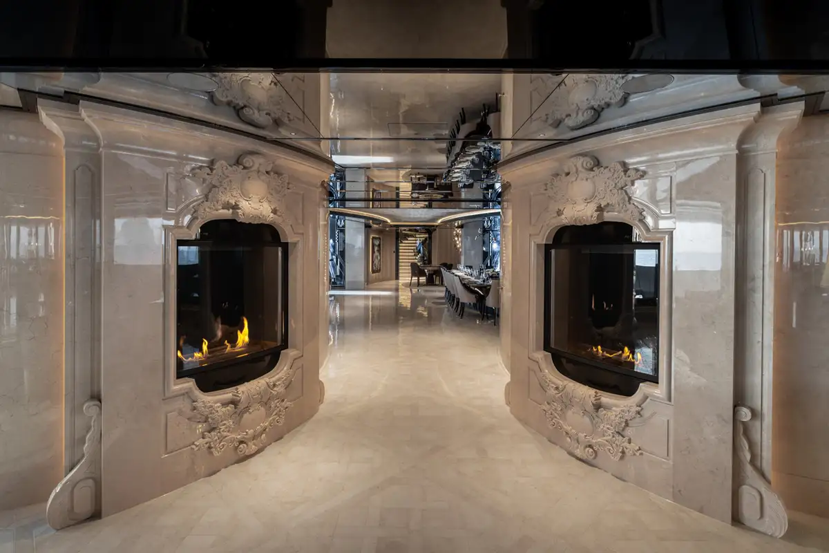There are many areas to enjoy the creations from KISMET’s chef; perhaps you’d like to dine on the uppermost deck with far-reaching views, or you’d prefer the lavish setting of the formal dining area on the main deck, twin fireplaces flank the entrance, creating the mood for the most special of occasions.