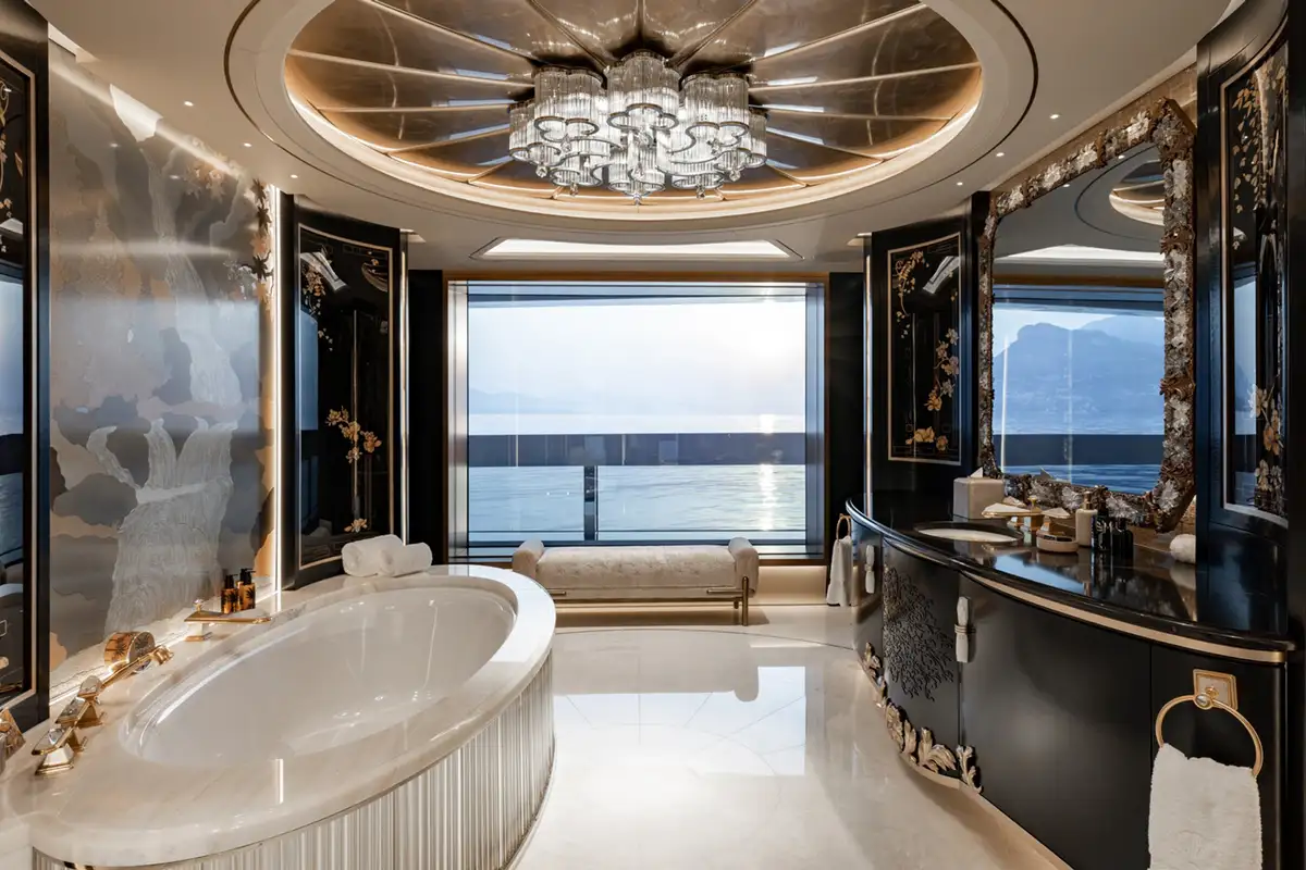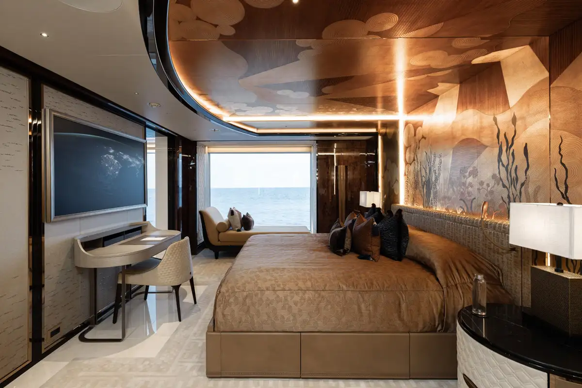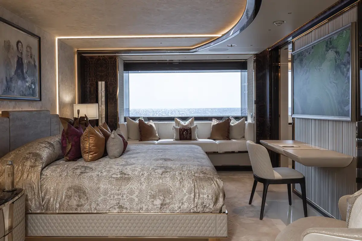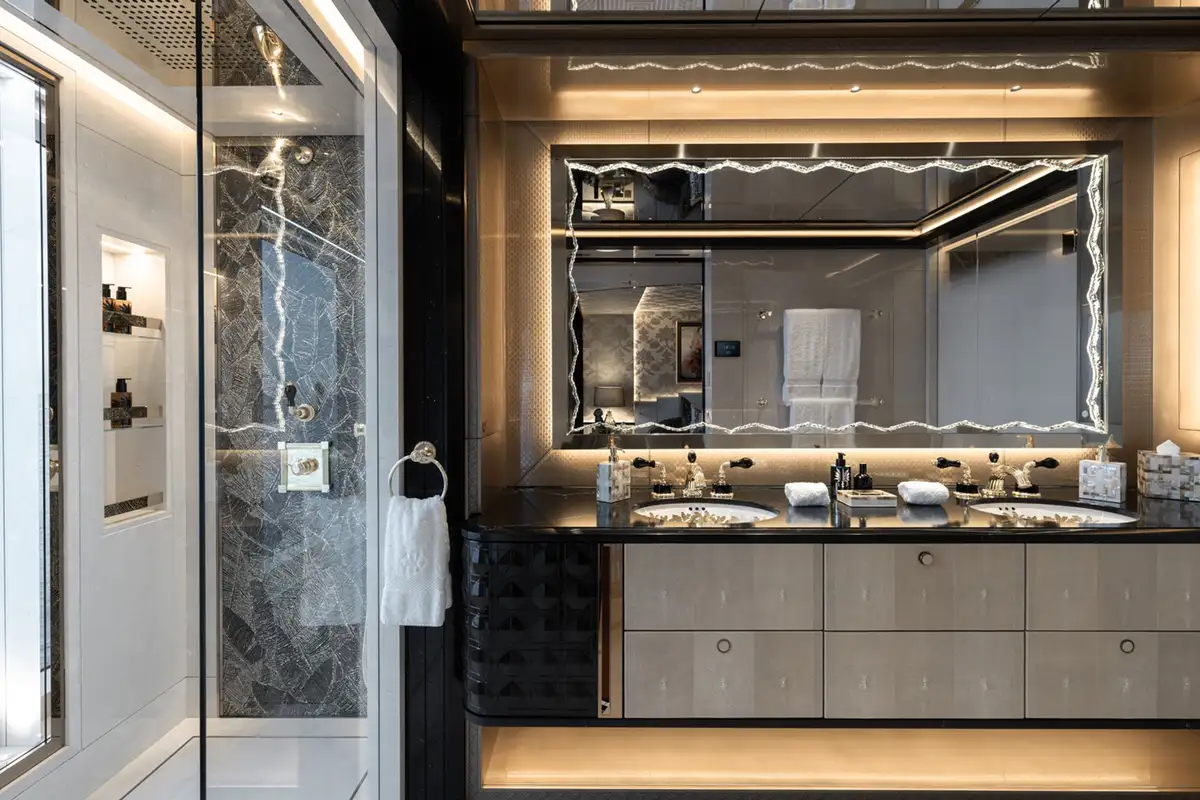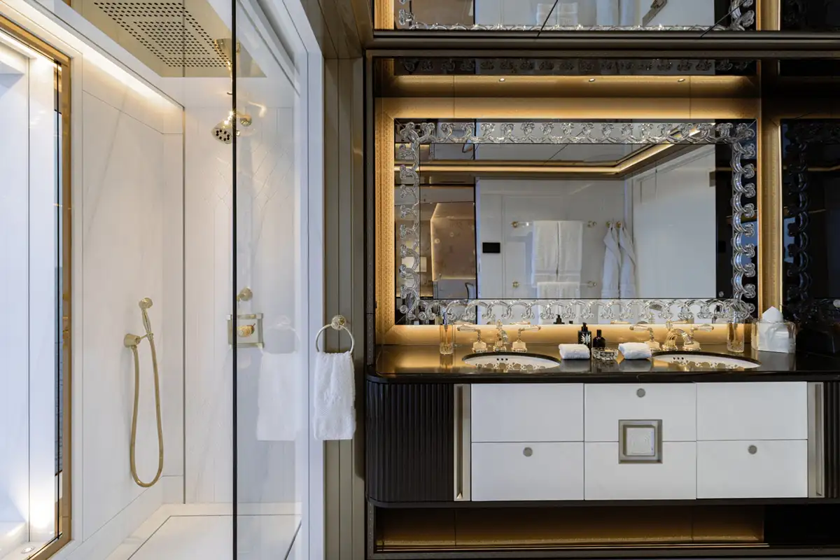 The master suite spreads across two decks. The sleeping area has floor-to-ceiling panoramic windows, stunning fabrics contribute to creating an opulent retreat. Separate his and hers bathroom, dressing rooms, an office area and a beauty suite inside and a private jacuzzi and terrace on deck, offer you an unrivalled realm to make your own.