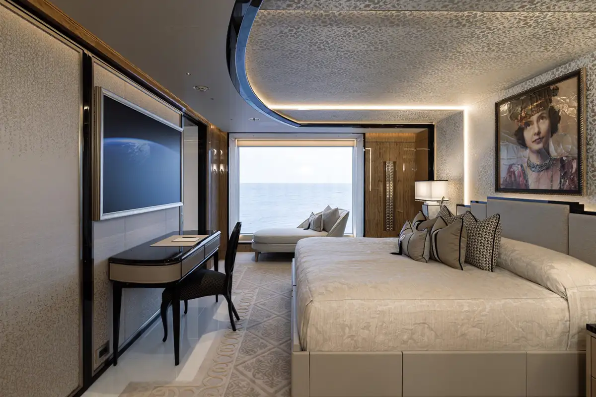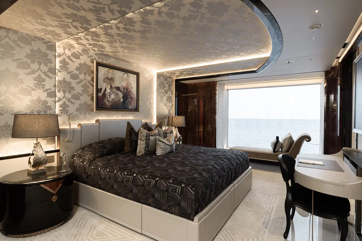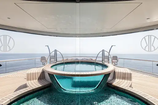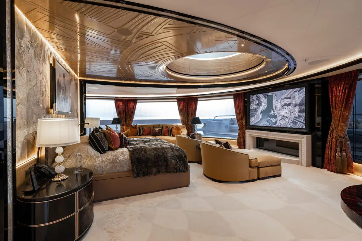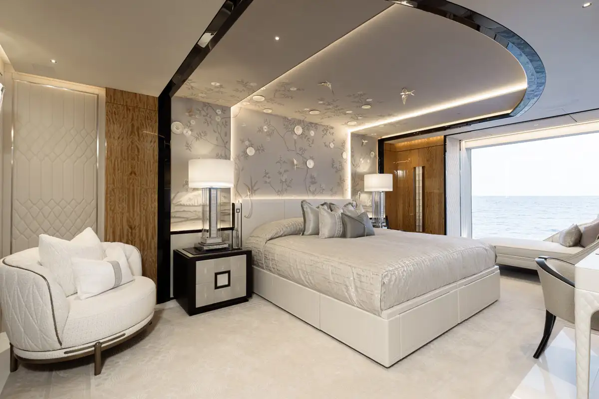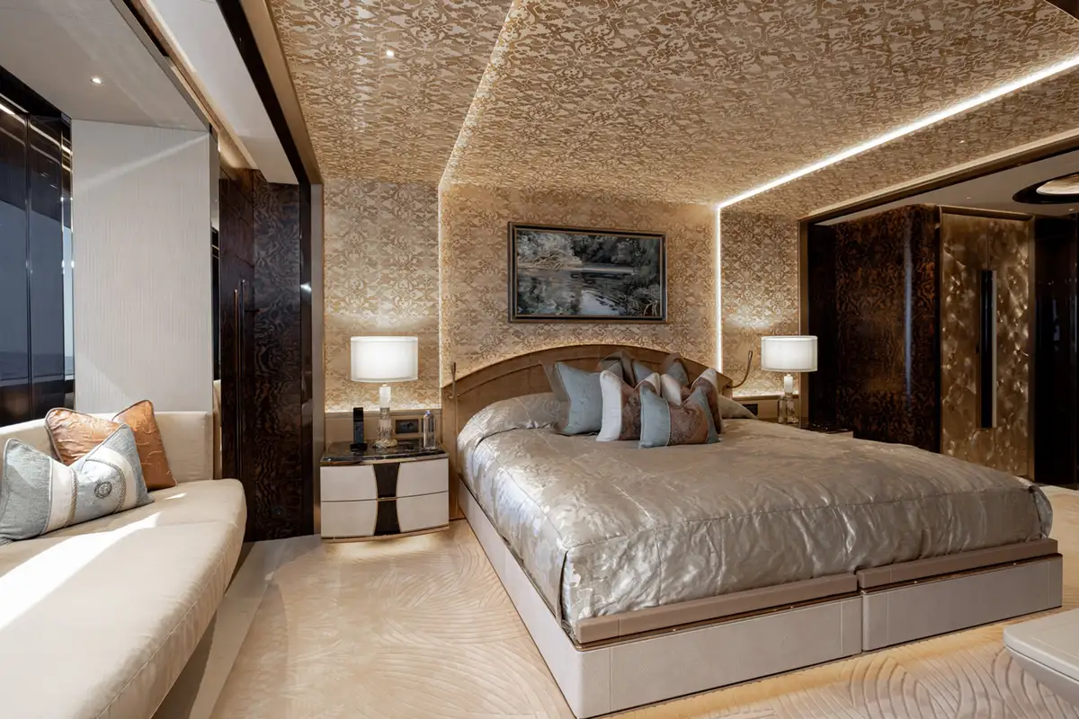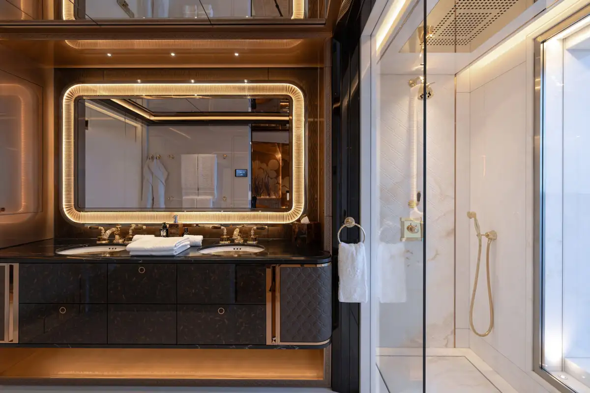 The master suite spreads across two decks. The sleeping area has floor-to-ceiling panoramic windows, stunning fabrics contribute to creating an opulent retreat. Separate his and hers bathroom, dressing rooms, an office area and a beauty suite inside and a private jacuzzi and terrace on deck, offer you an unrivalled realm to make your own.