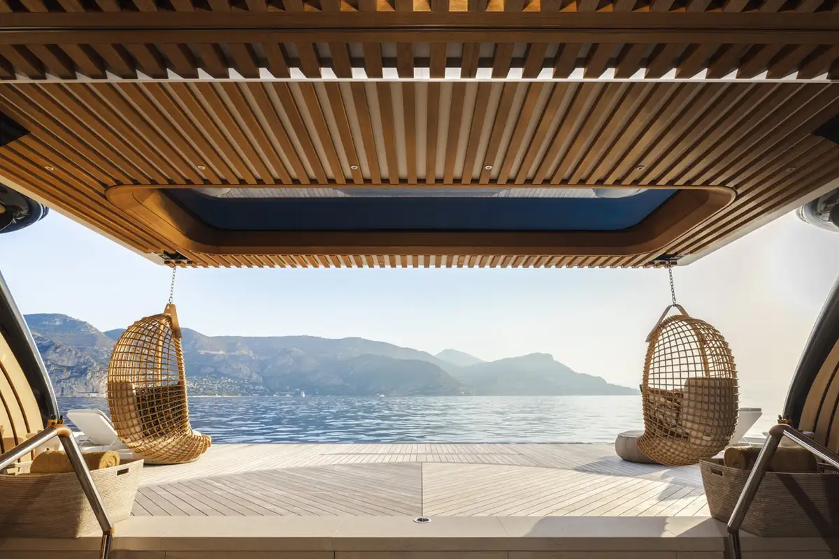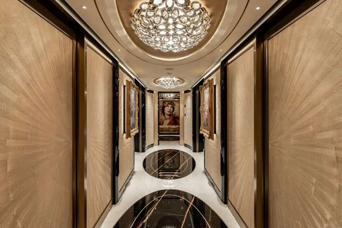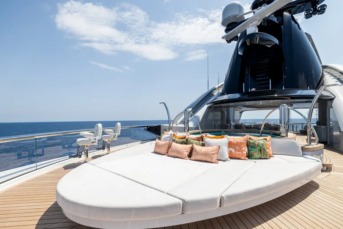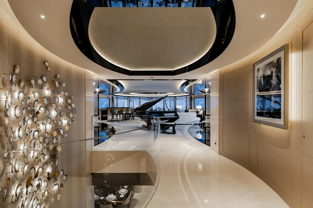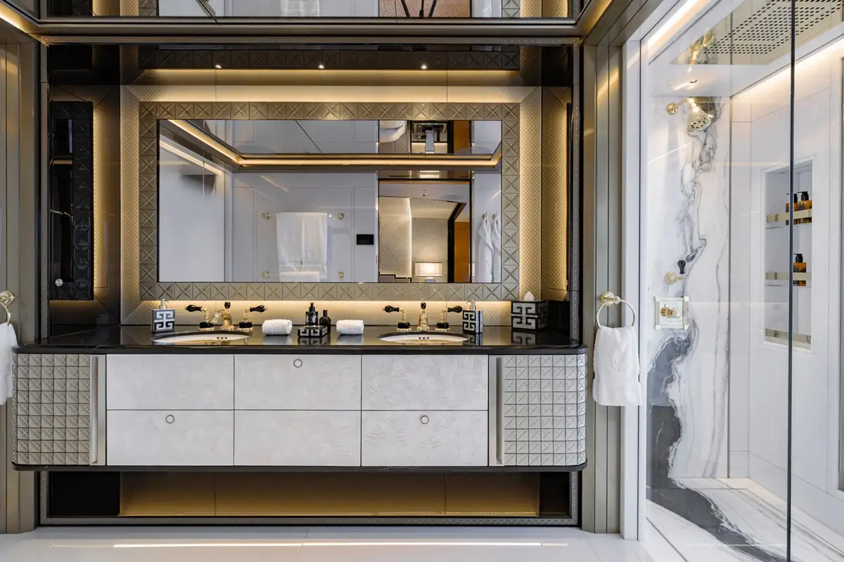 The master suite spreads across two decks. The sleeping area has floor-to-ceiling panoramic windows, stunning fabrics contribute to creating an opulent retreat. Separate his and hers bathroom, dressing rooms, an office area and a beauty suite inside and a private jacuzzi and terrace on deck, offer you an unrivalled realm to make your own.