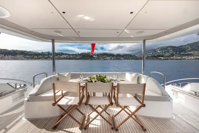 From sunrise lounging on the foredeck to sunset cocktails aft, KORA’s versatile outdoor spaces invite you to unwind in style. On the sun deck, a private secondary lounge offers a secluded retreat for quiet moments or shaded dining with a breeze.