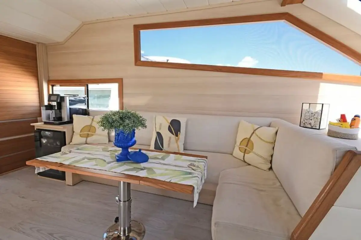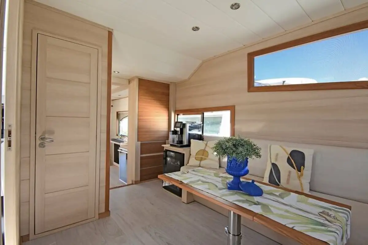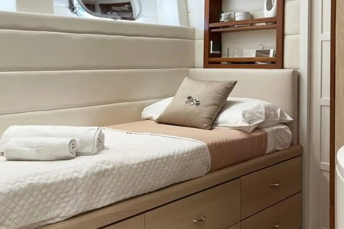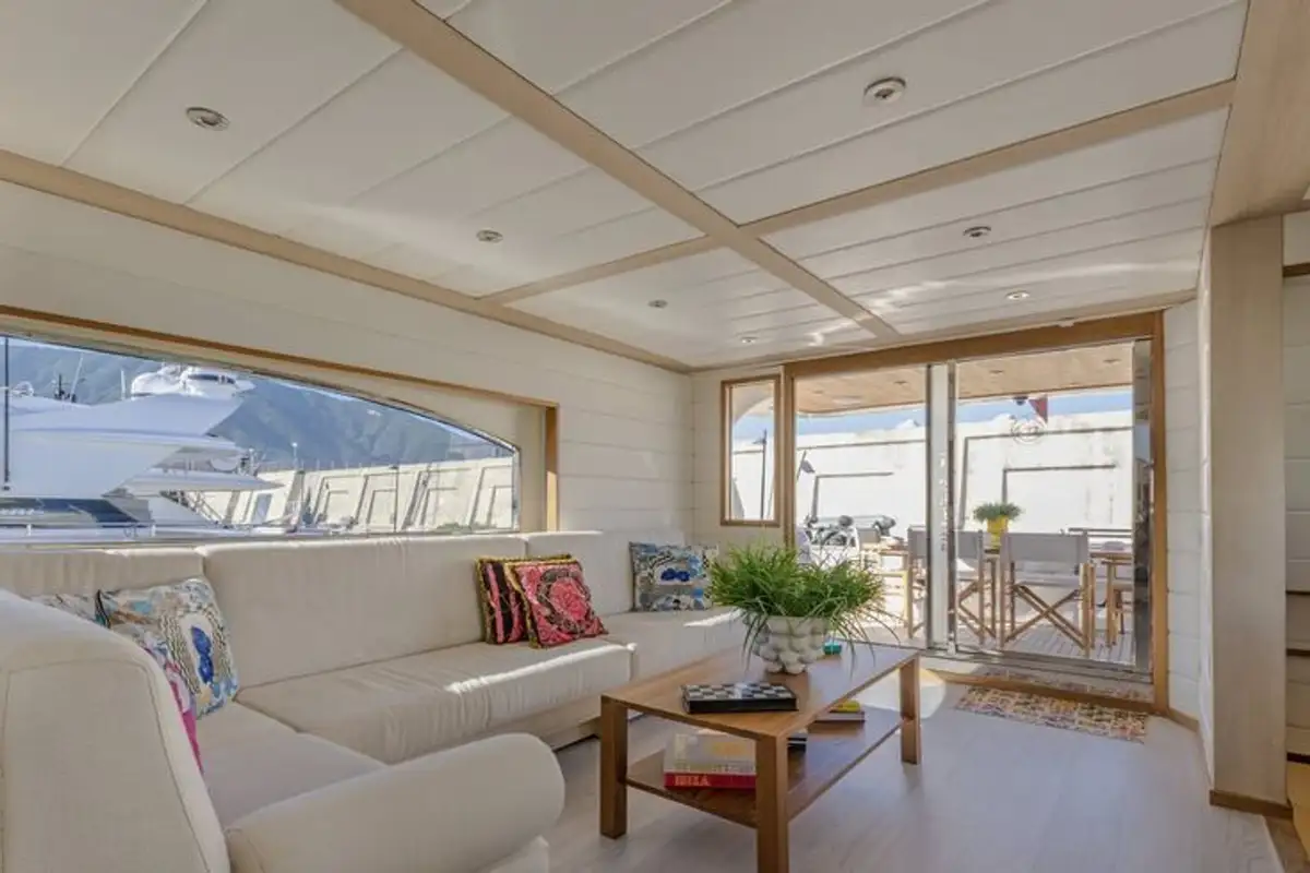 The sun deck has a dining area and a relaxation area with sun beds. The lounge blends seamlessly with a spacious aft section, which is furnished with a sofa and a table that seats up to eight diners. Forward, guests can find a sunbathing area that can be converted into a lounge area with a coffee table.