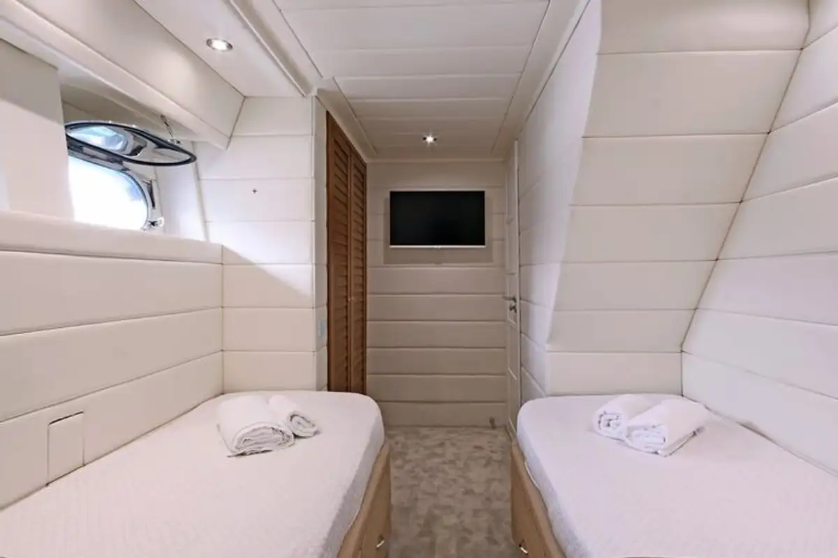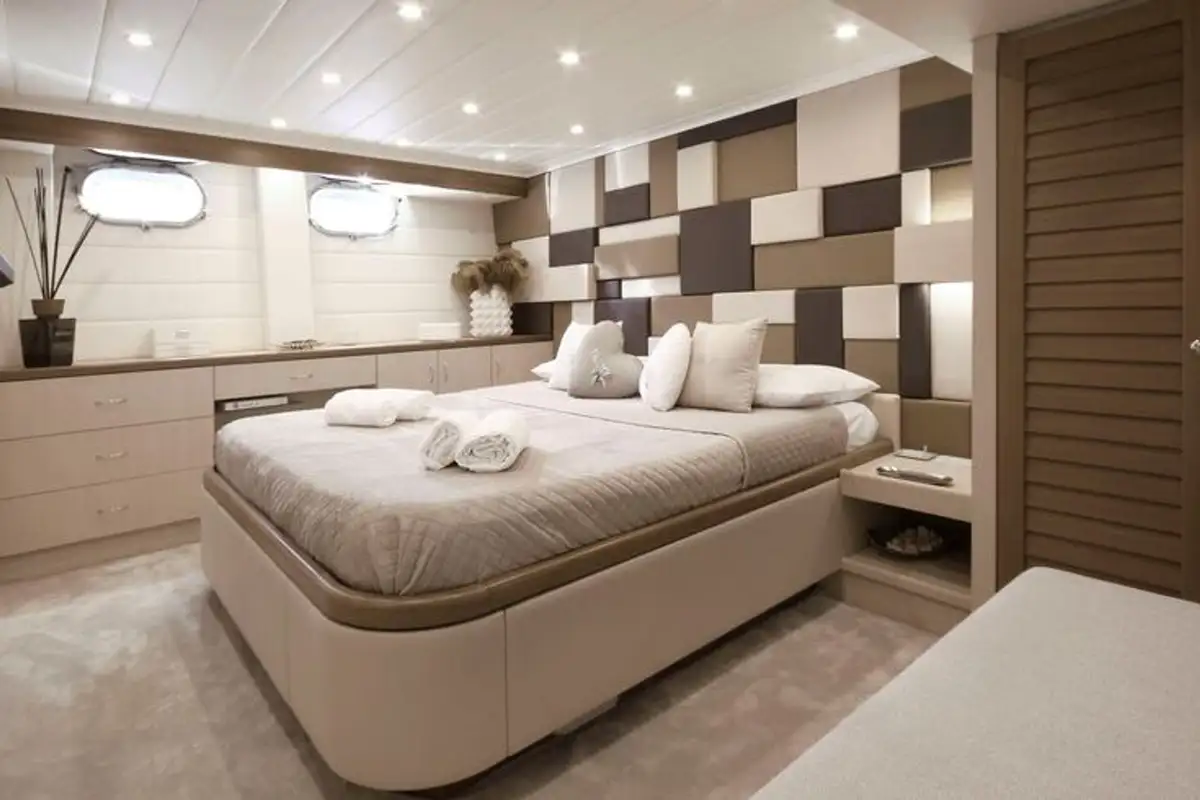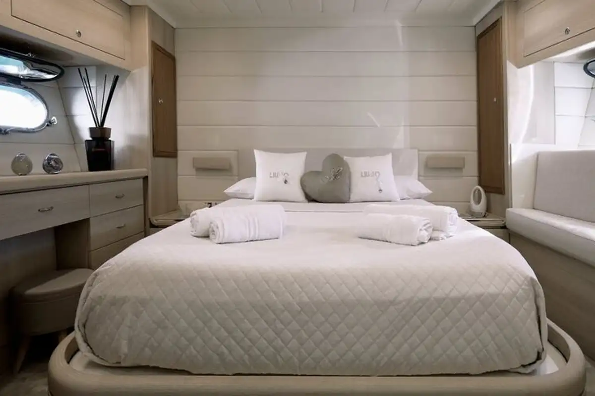 Indoors, sunlight pours through generous windows, flowing out to an aft seating area set for shaded, breeze cooled dinners. Wander forward and you’ll find broad sun pads that morph into a laid back lounge for morning cappuccinos or sunset spritzes. Ascend to the sun deck for leisurely Mediterranean lunches, a panoramic breeze and the kind of languid afternoons that melt into night under a canopy of stars.
