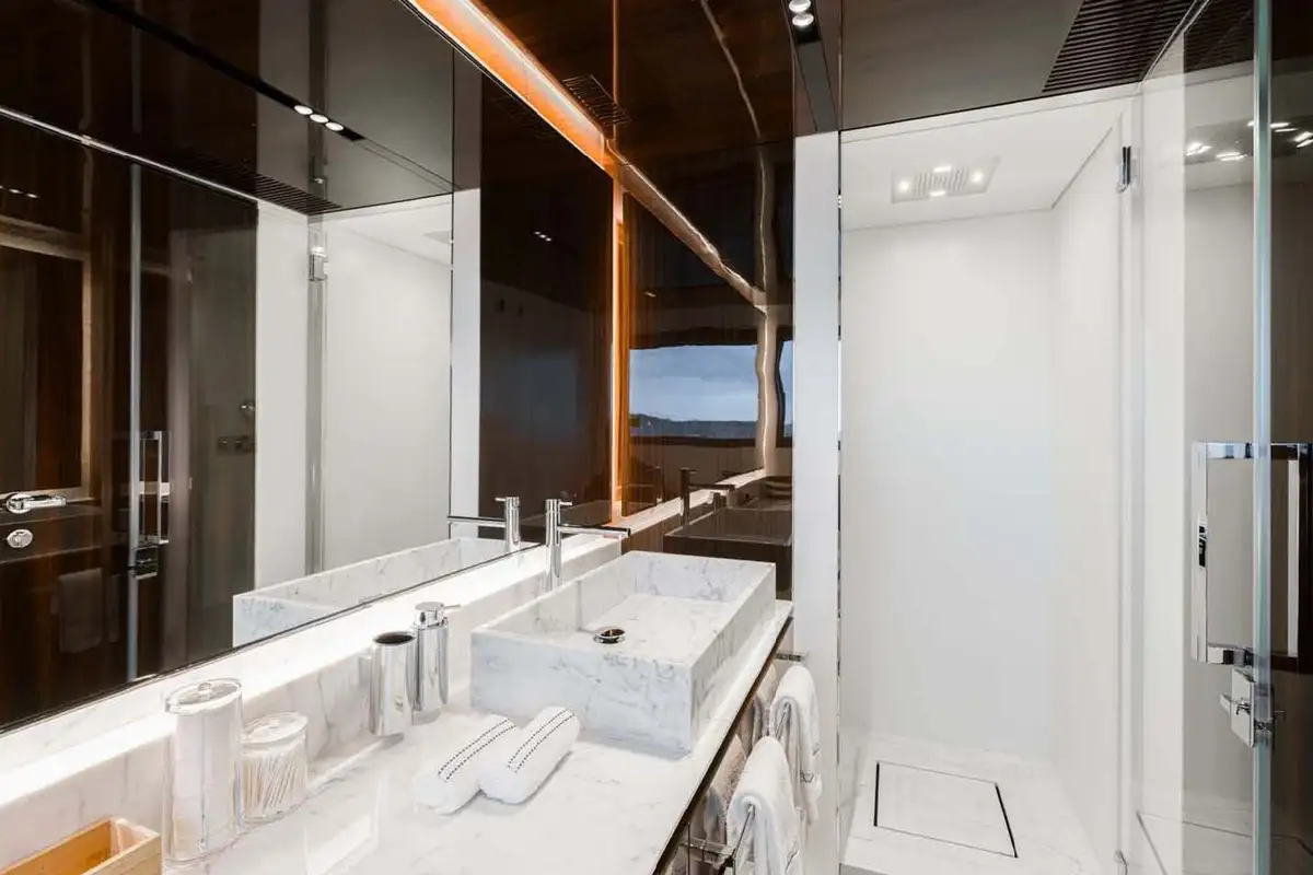 This is a yacht built for both relaxation and entertainment. From the moment the sun sets, underwater lights transform the water into a shimmering spectacle. The on board toybox is fully loaded with jetskis, SeaBobs, stand up paddleboards, and more, offering endless ways to enjoy the ocean. Whether you're seeking peaceful afternoons at anchor or high-energy adventures, LADY FIRST is equipped to deliver.