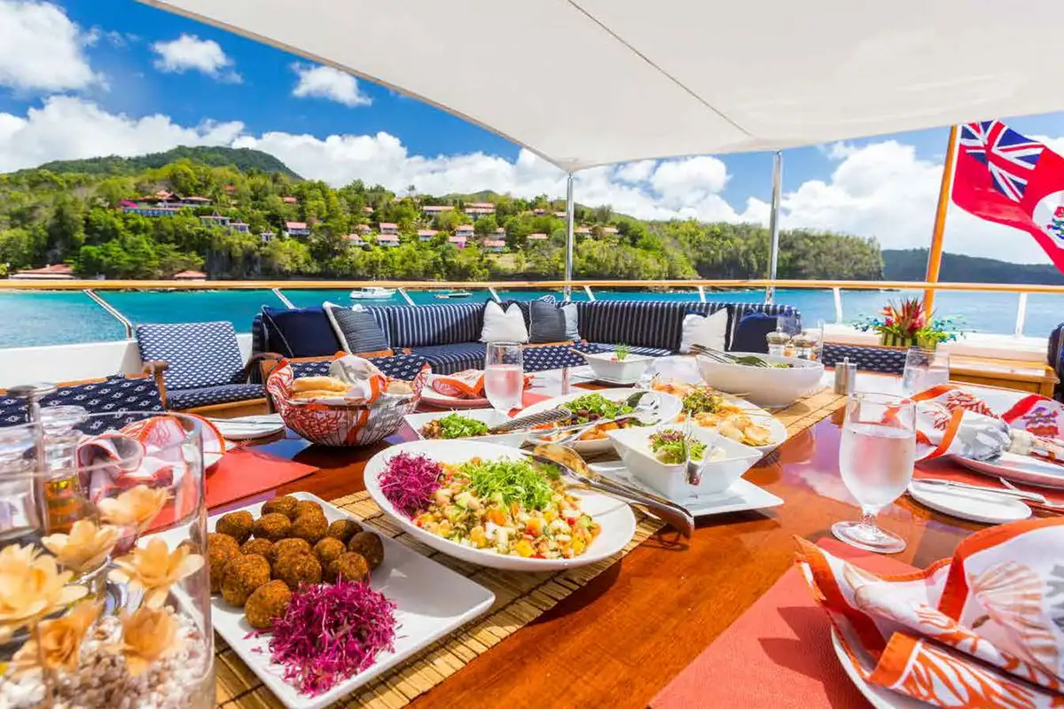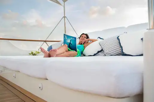 On the upper deck, encircled by high-bulwarked side decks, the panoramic views and serene feel of the sky lounge beckons. Whether relaxing indoors on the plush sofa or engaging in lively conversation around the games table, guests are surrounded by luxury at every turn. On deck, the al fresco dining area provides a picturesque setting for savouring gourmet delights against the backdrop of a beautiful anchorage.