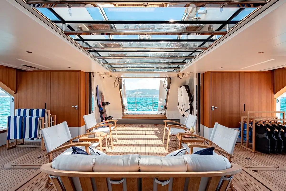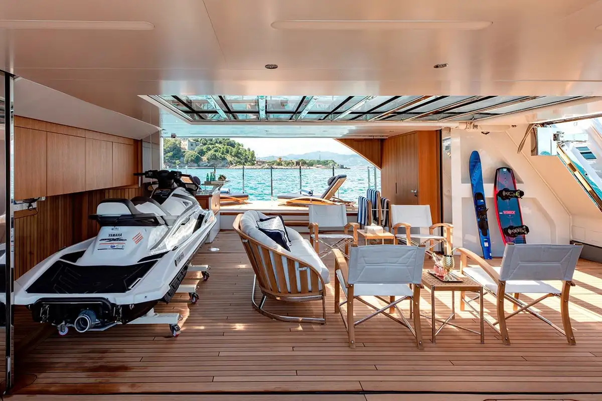 All of Lady Lena’s outdoor spaces are superb. The 90sqm sundeck embraces its position at the top of the vessel, with panoramic views from the 8-seater jacuzzi, sunbeds, informal dining space and relaxed seating. Meanwhile, the huge 80m2 beach club makes the most of its position on the water, with a float-in tender dock and fold out balconies, which give direct swimming access to the warm Mediterranean waters, and to the vessel’s huge range of water toys. However, the highlight of La