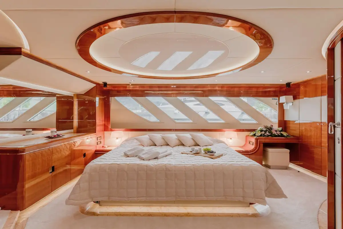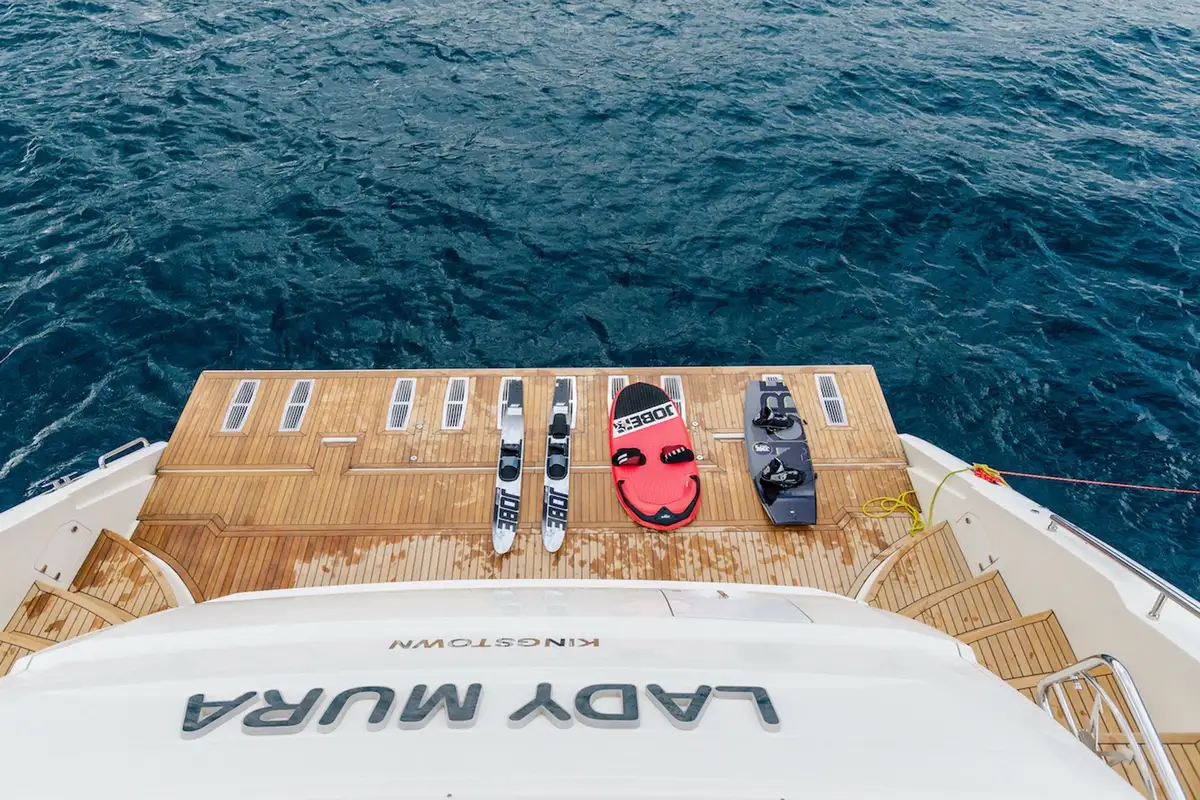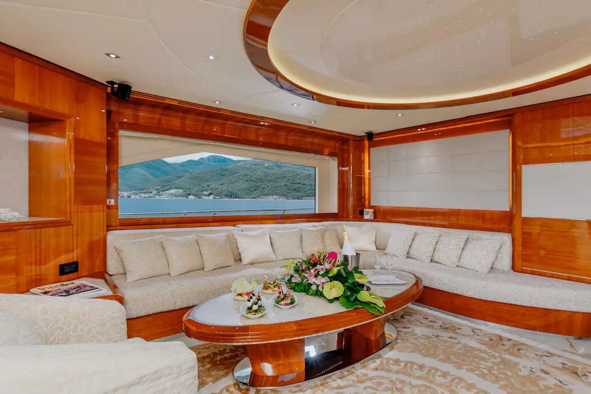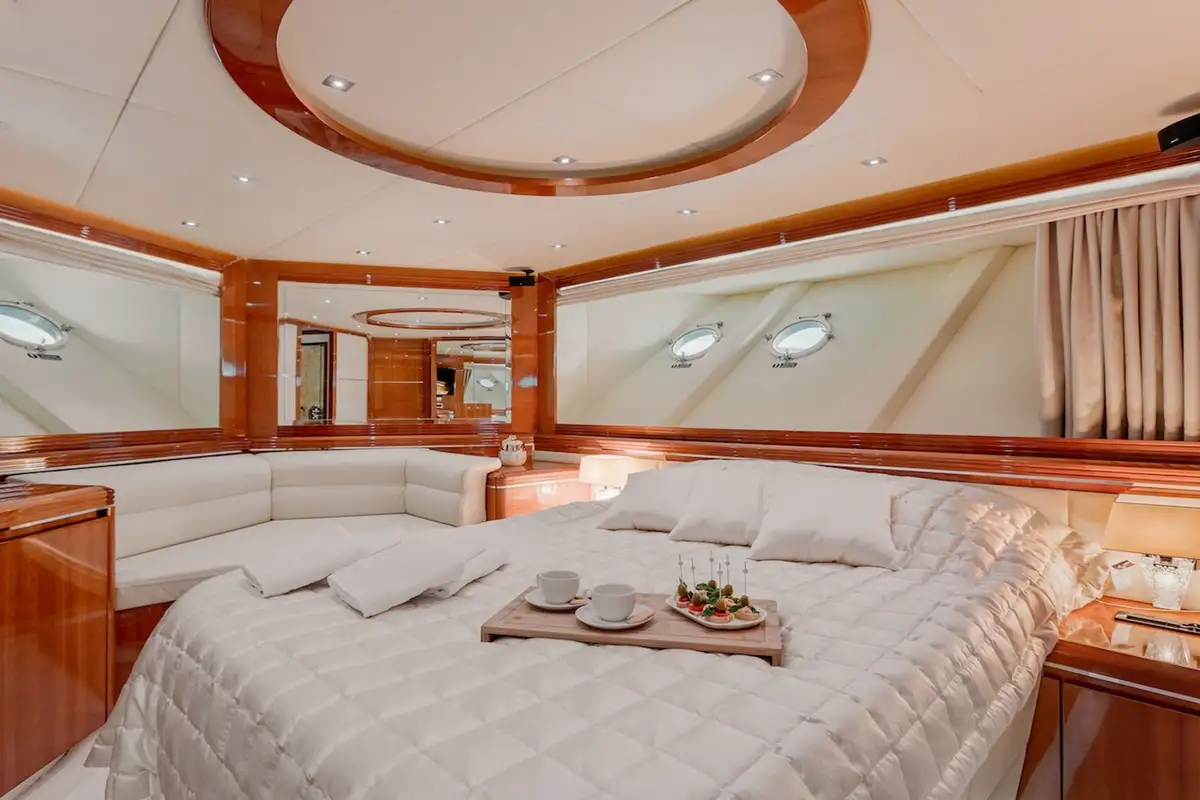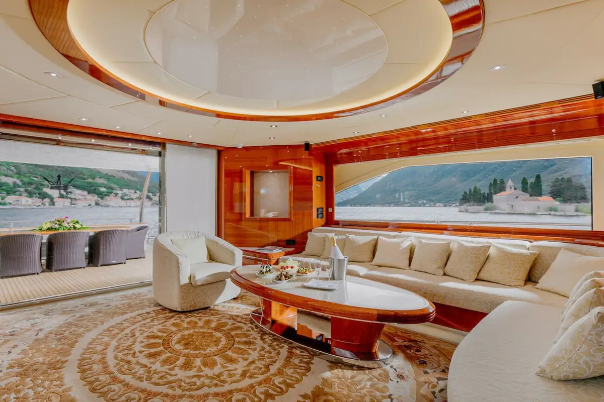 Lady Mura is a 29m Dominator built in 2010. This modern and sleek yacht accommodates up to ten guests in five cabins, along with a warm and welcoming crew of six that will ensure an unforgettable stay while cruising in the Mediterranean. The yacht’s interior decor is contemporary and warm, creating a harmonious ambience. Her large salon features elongated side windows that provide ample natural light throughout. All five cabins have private en-suite facilities and are fully air conditioned.