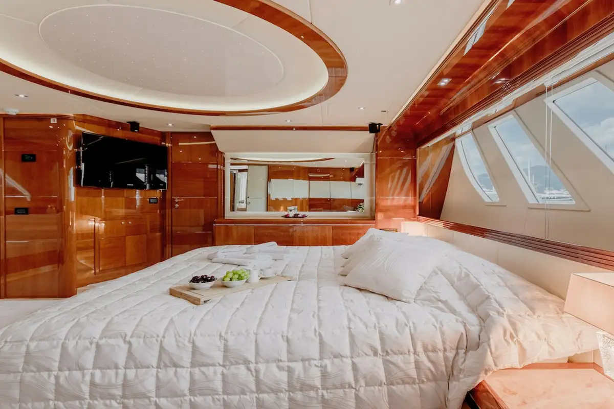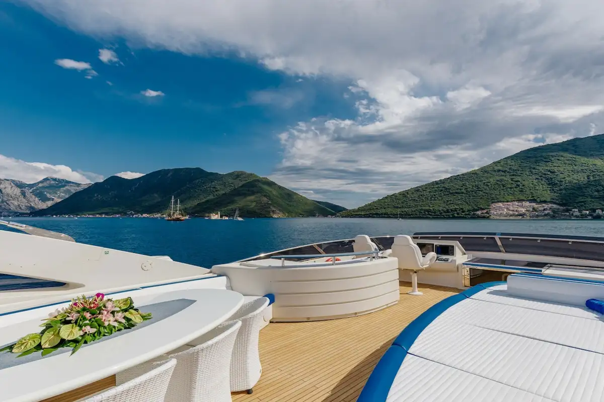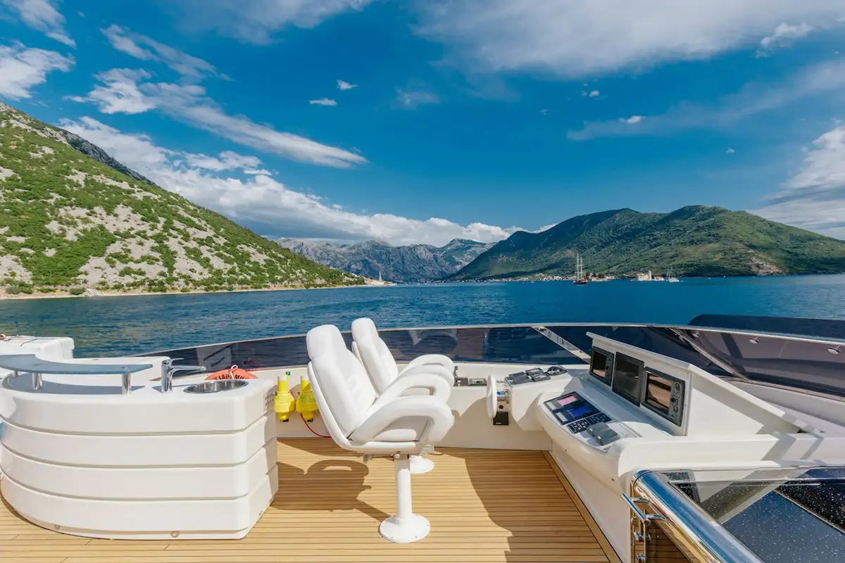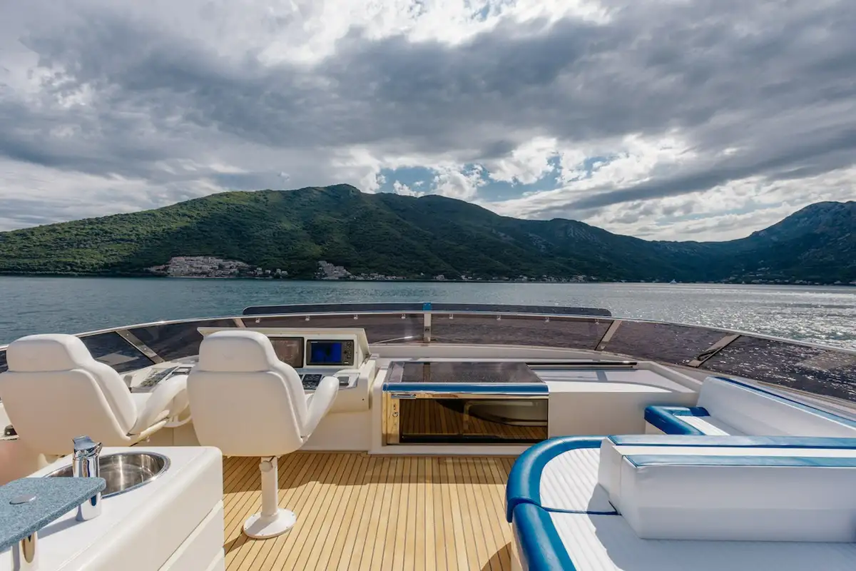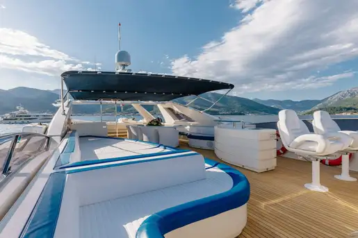 Her exterior living areas are well-appointed on two levels. Aft of the salon, a sliding door leads to a shaded alfresco dining area, which is a favorite social area among guests. The foredeck has a large seating area with a pop up Bimini cover, hot tub and sunpads while on the upper deck, the yacht features a massive sunpad, wet bar, retractable TV, BBQ station, alfresco dining and optional shade.