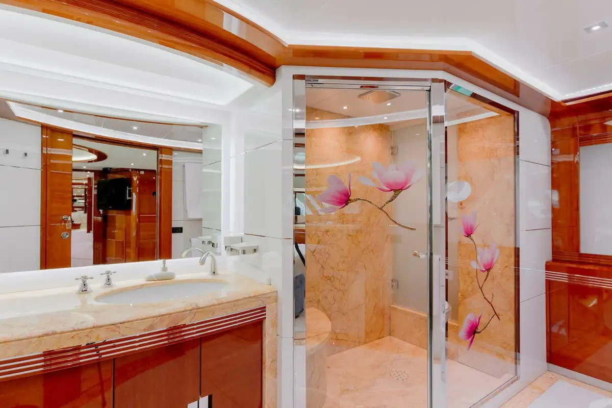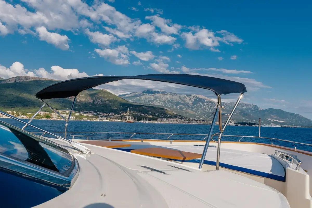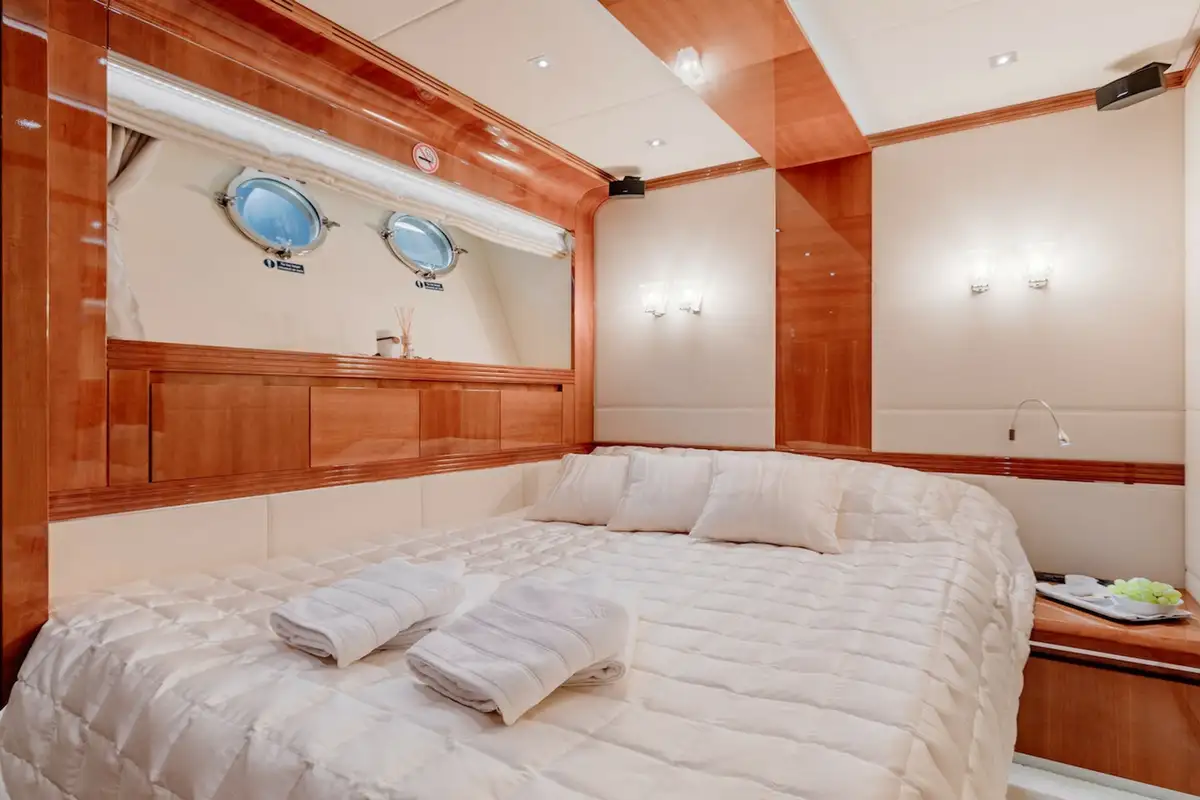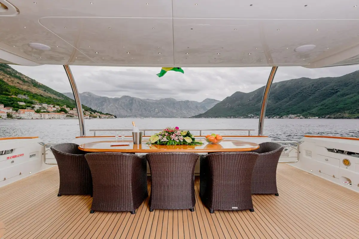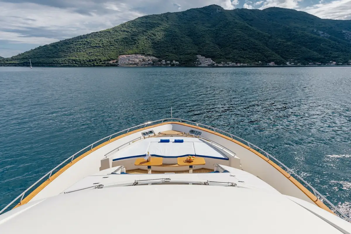 Her exterior living areas are well-appointed on two levels. Aft of the salon, a sliding door leads to a shaded alfresco dining area, which is a favorite social area among guests. The foredeck has a large seating area with a pop up Bimini cover, hot tub and sunpads while on the upper deck, the yacht features a massive sunpad, wet bar, retractable TV, BBQ station, alfresco dining and optional shade.