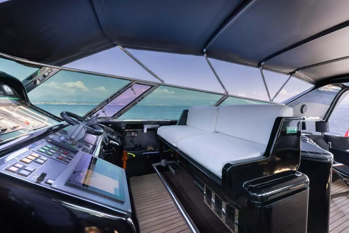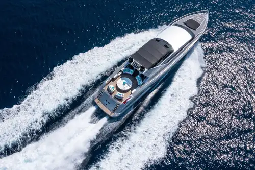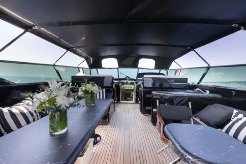 If you or your guests need relief from the sun, just ahead is the shade and shelter of the al fresco lounge area. Protected by a soft top, your party can dine al fresco in comfort. Ahead is the wet bar and the raised helm – enjoy a captain’s view as LAUREN V opens up 3200hp connected to waterjets. With a cruising speed of 20 knots, a top speed of 25 knots and impressive manoeuvrability, you’ll never forget your time on this awesome yacht.