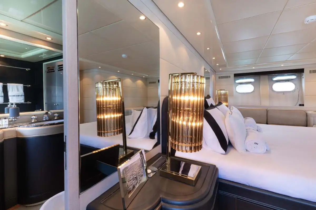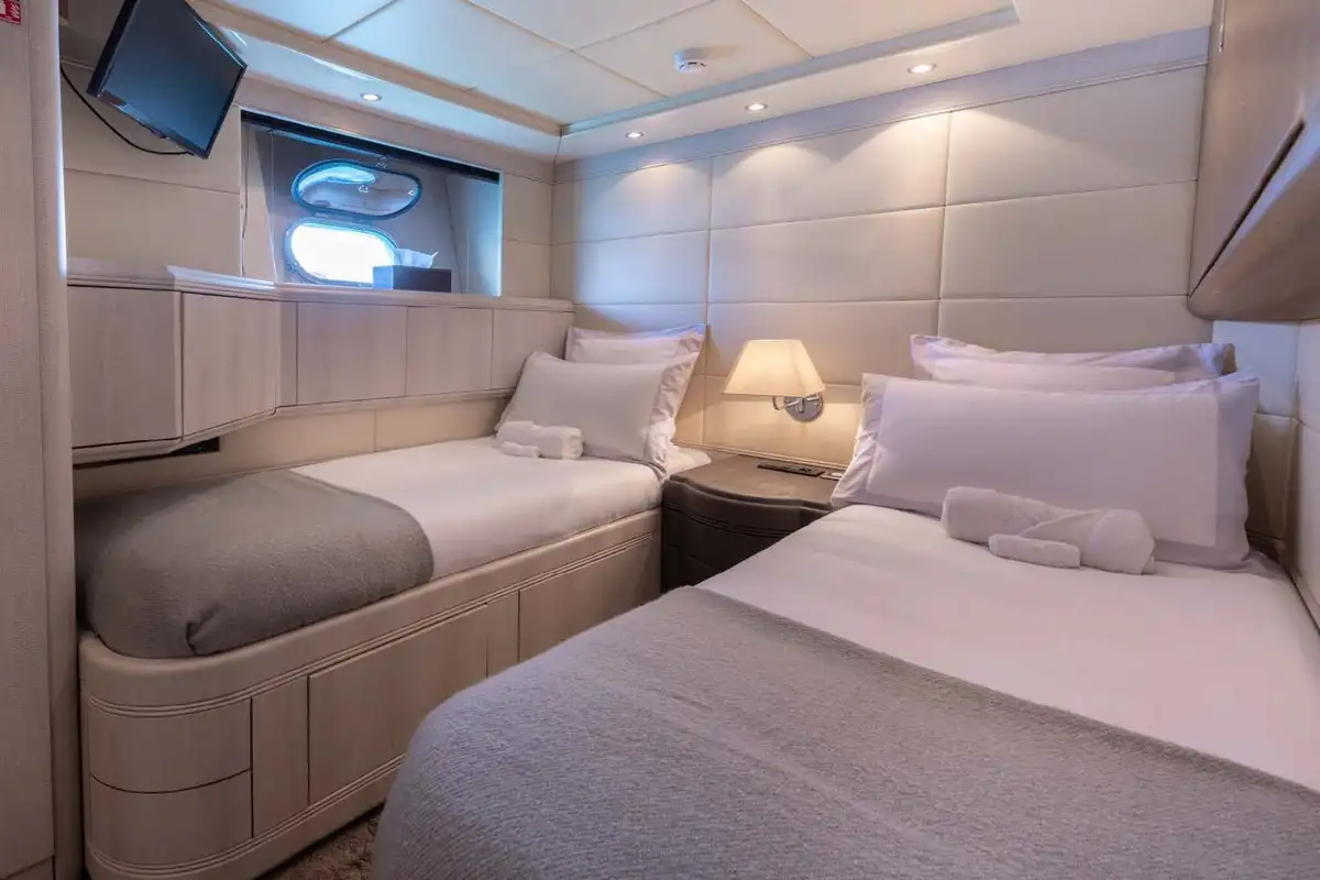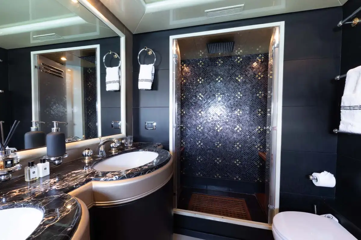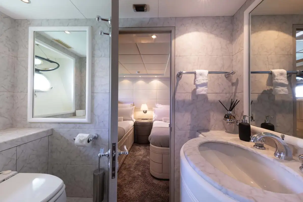 From the lounge, you can retire to the lower deck and the grand guest suites. Forward, there is a lavish double VIP suite. Aft of the guest suites is the full-beam master suite, featuring a queen-sized berth, an en-suite bathroom with his and hers vanity units, and a separate shower compartment. Perfect to refresh and revive. Between these two gorgeous double suites are two twin-berth suites (one with a pullman berth) that share the same fine styling features found throughout this immaculate yacht.