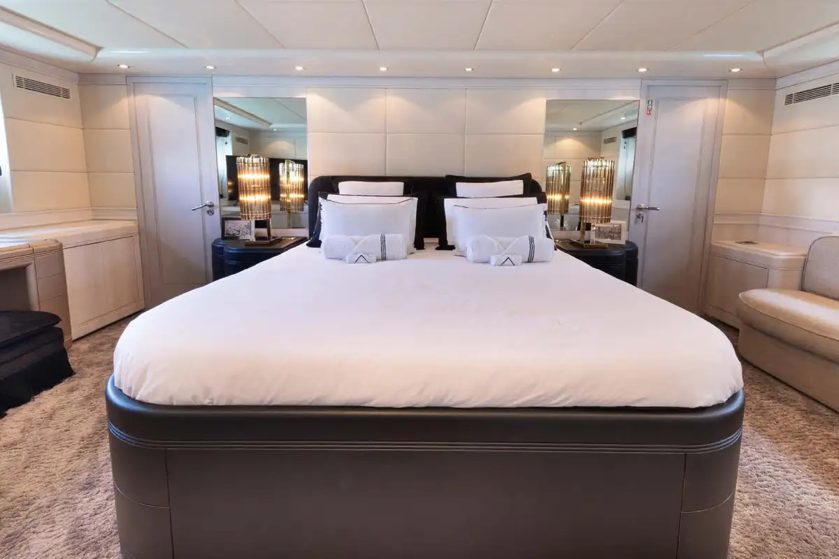 The Mangusta 105 was designed to maximise an al fresco lifestyle. LAUREN V 32m (103ft) features stunning deck spaces, a super cool appearance, and is fresh from a recent 2022 refit – she is a yacht to see and be seen on. Updated and restyled with a metallic silver hull, with jet black detailing, her presence is beguiling and a testament to her designer Stefano Righini.