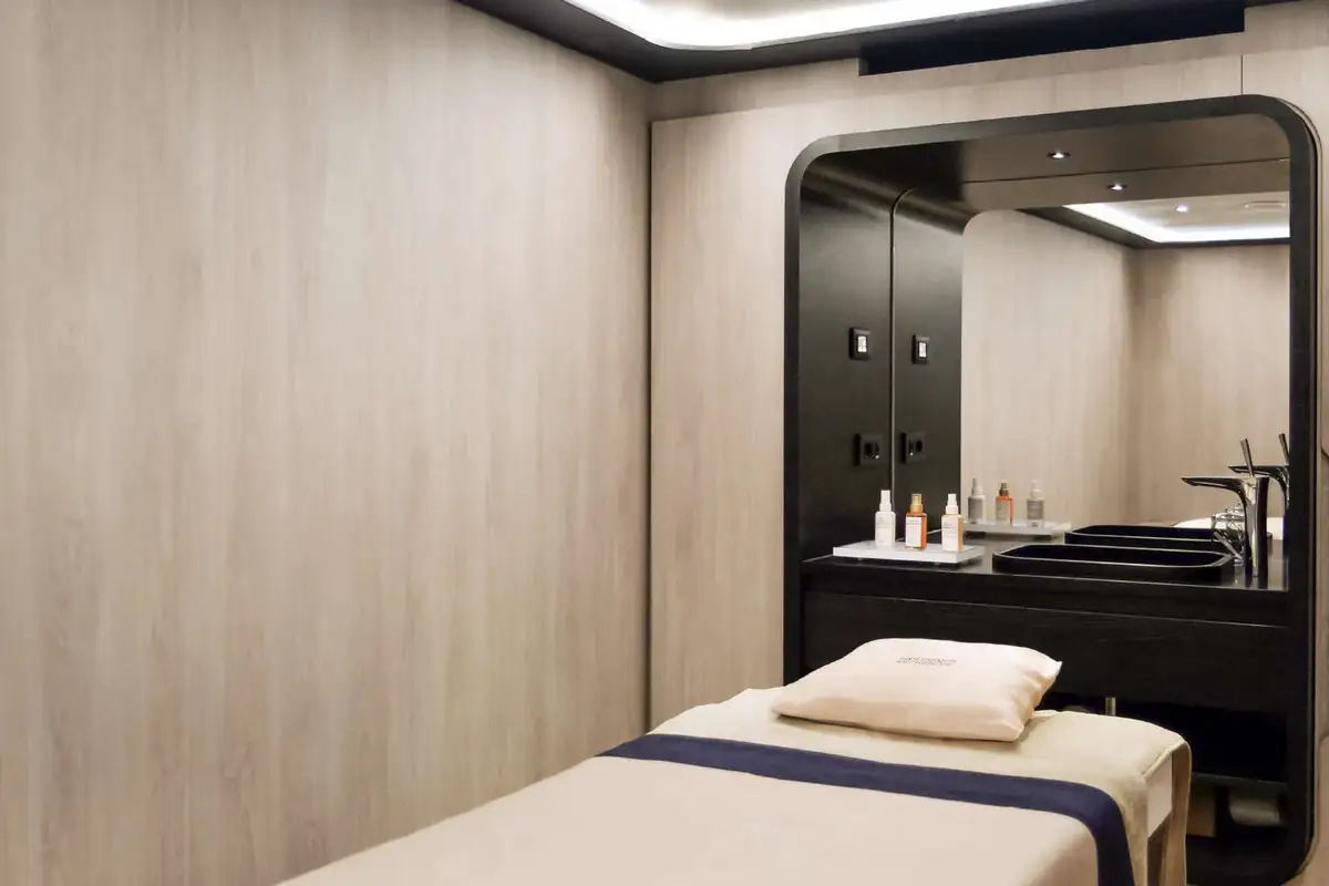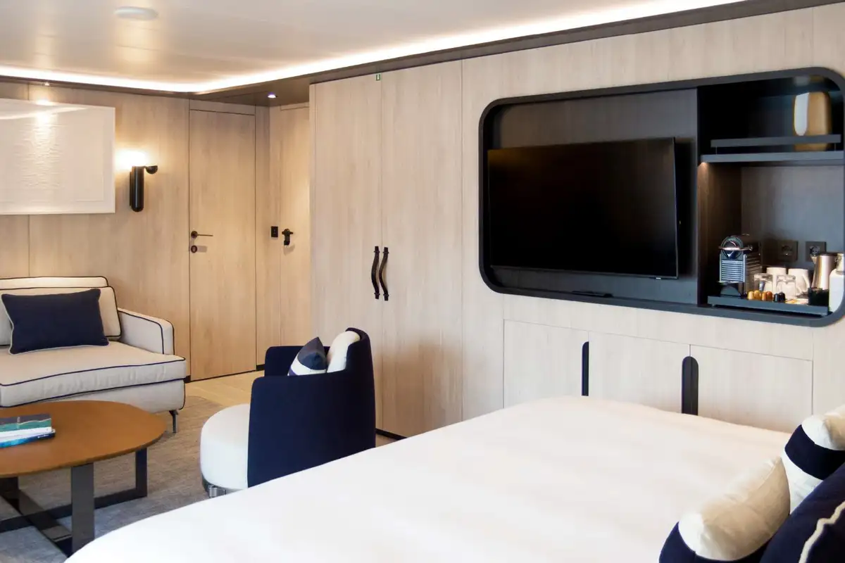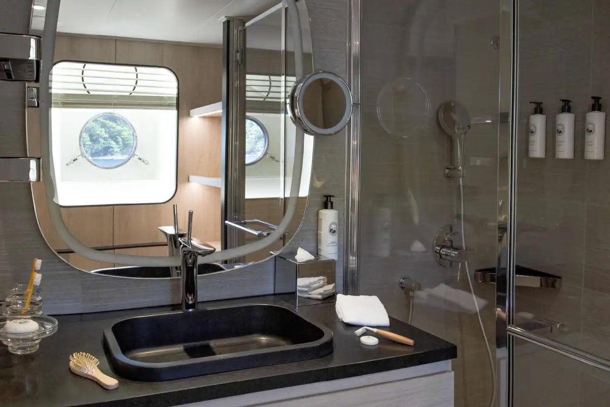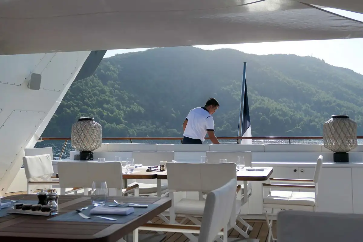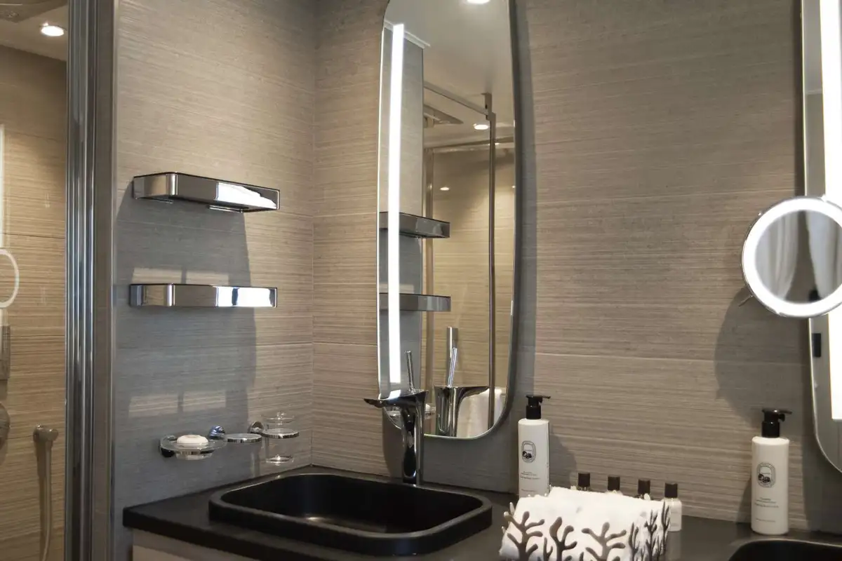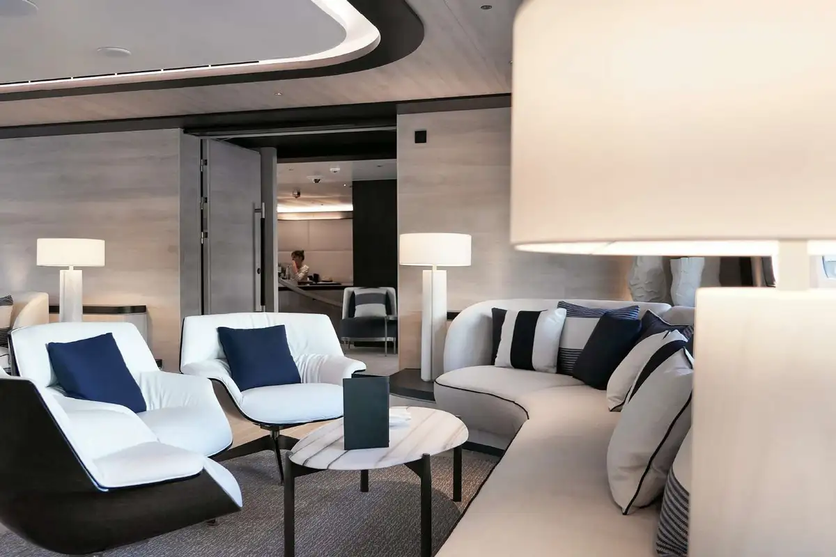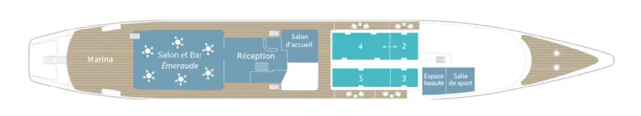 The inside guest facilities include a spacious, comfortable lounge with a full cocktail bar and a gourmet restaurant – each of these have their own open-air terraces on the upper and main aft decks. There’s a dedicated gym with state-of-the-art equipment, plus a fitness instructor and yoga sessions are held on the sundeck. The onboard wellness centre has a full-time professional therapist offering a variety of massages and treatments.