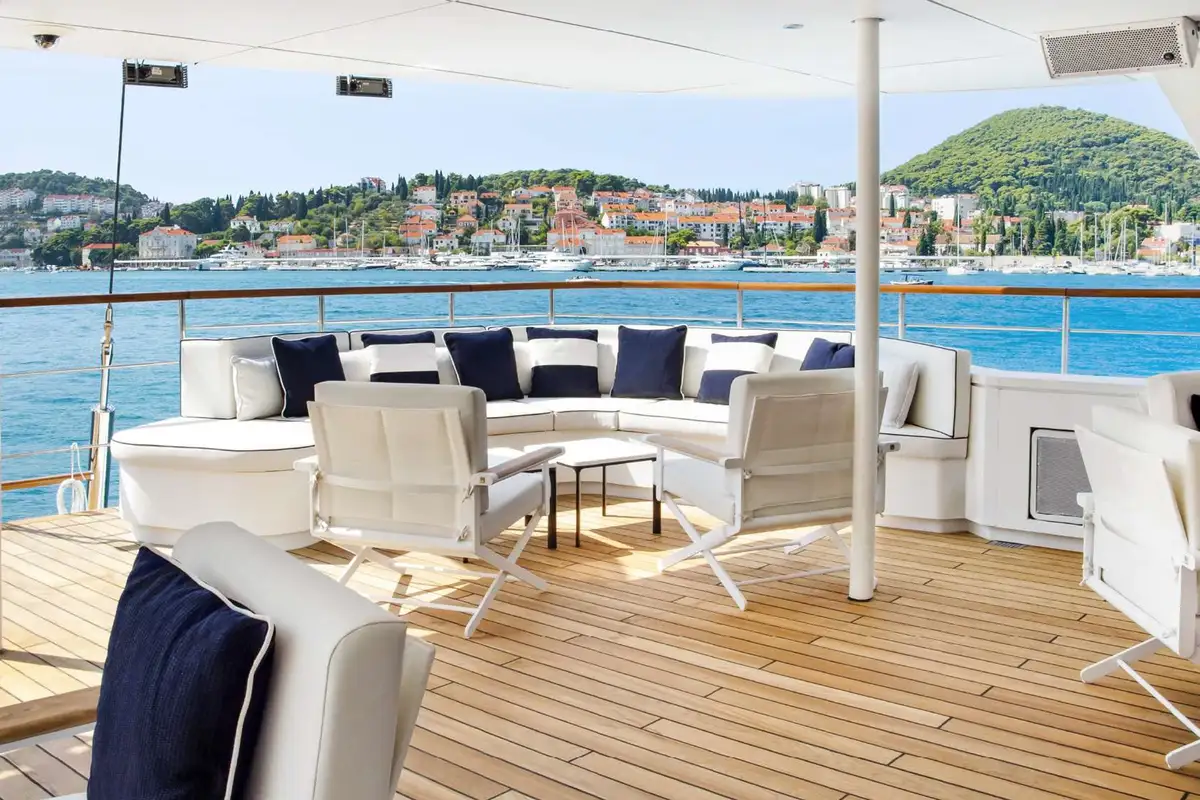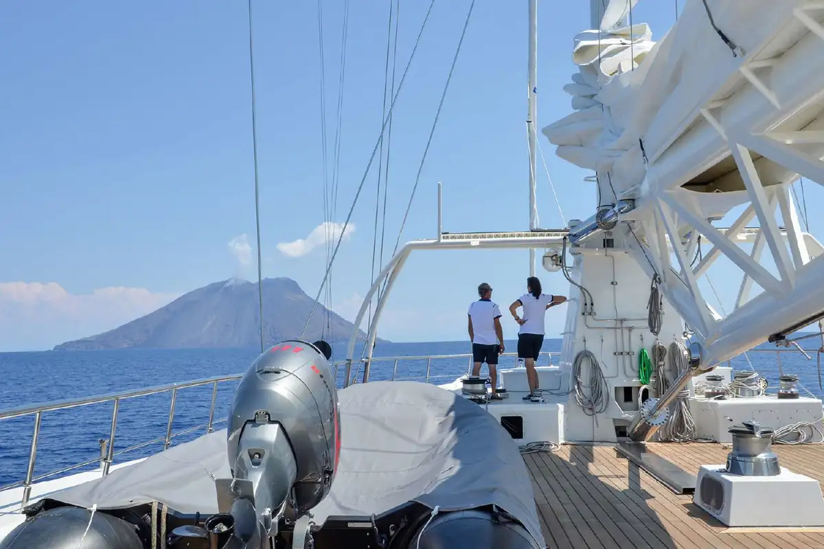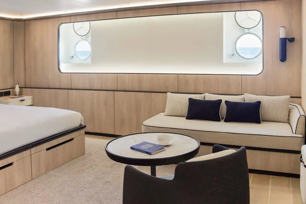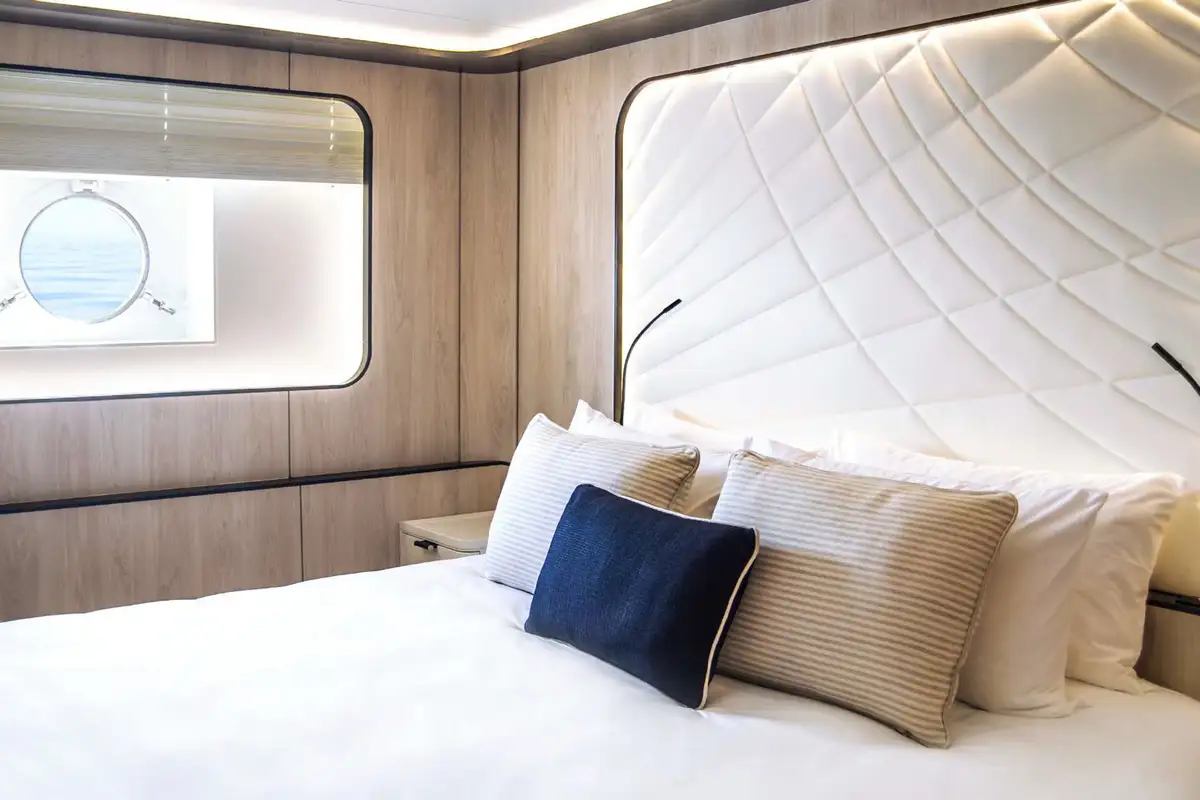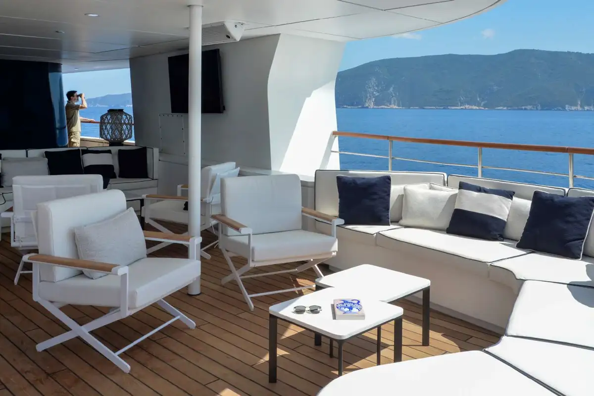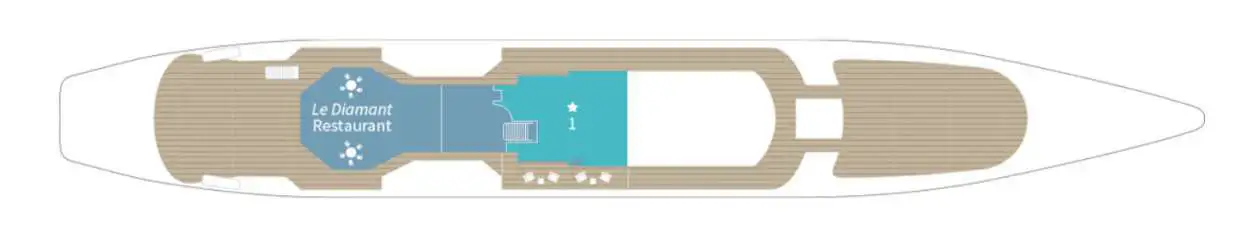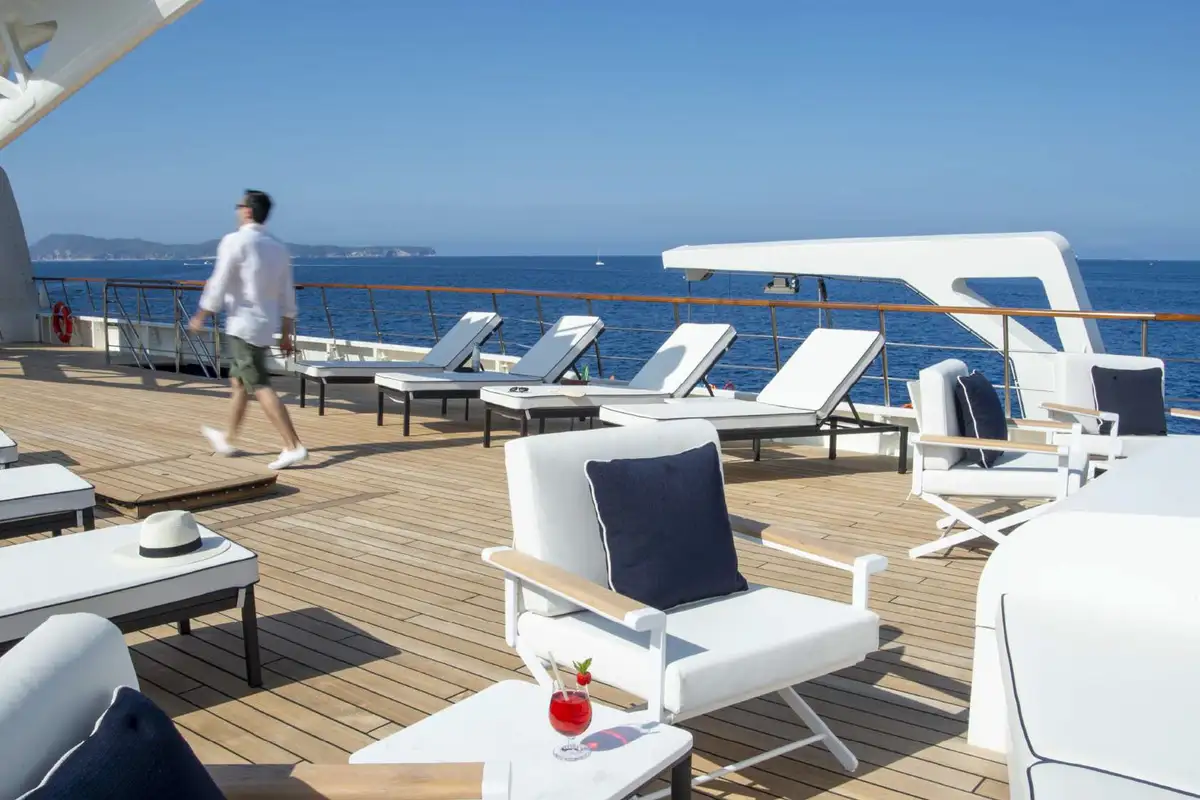 One of her strongest suits is the huge expanse of outside deck space on board. This includes a sundeck that safely puts you right at the heart of the sailing action when she’s cruising from one destination to the next, with seats, loungers and a bar, plus additional space on the foredeck and, as mentioned above, the two shaded and sheltered aft decks.