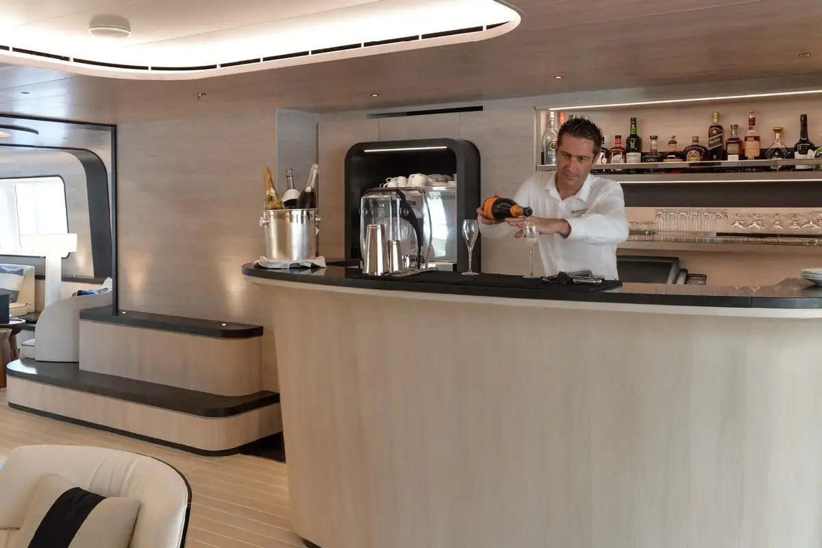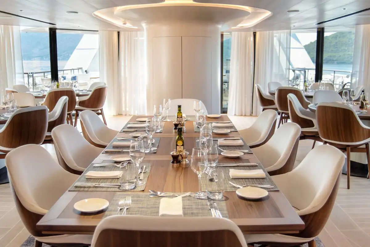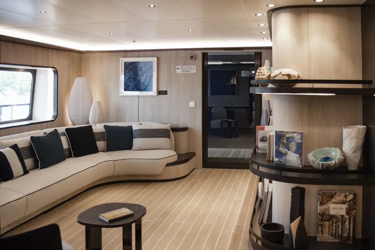 She also has a superyacht-style stern with an expansive bathing platform that’s ideal for boarding her four expedition-grade RIB tenders, launching her kayaks, paddleboards and windsurfers, or simply diving in for a swim. She carries a fleet of underwater sea scooters and scuba diving gear for underwater exploration, and a sea pool is deployed from her stern for safe, jellyfish-free bathing when the anchor goes down in a secluded, sheltered bay.