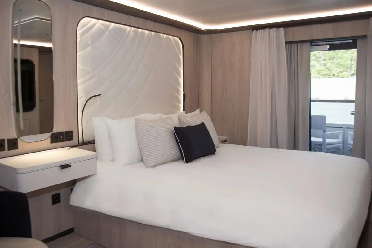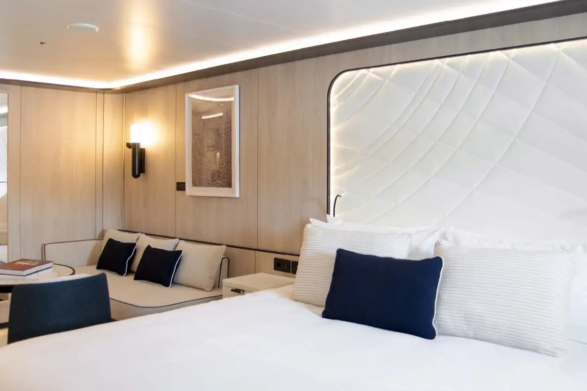 Brought up to date in a full refit three years ago, LE PONANT’s vast tri-deck interior is designed to host up to 32 guests in 16 large double cabins, with service from a crew of 34. Her interior style is contemporary – restrained, tasteful, clean and bright. All cabins have a private en suite bathroom. Those on the upper decks have their own outside terraces and floor-to-ceiling windows as well as lounge areas and desks.