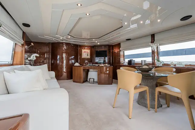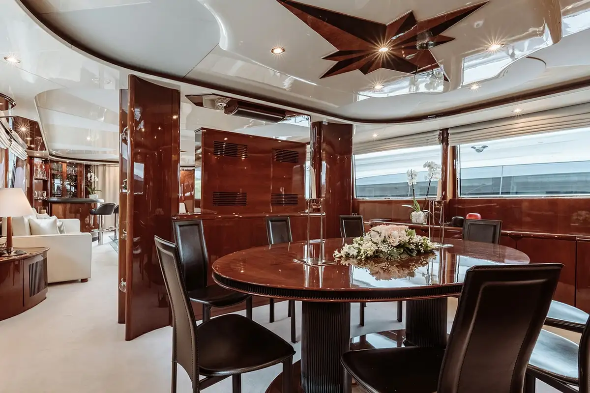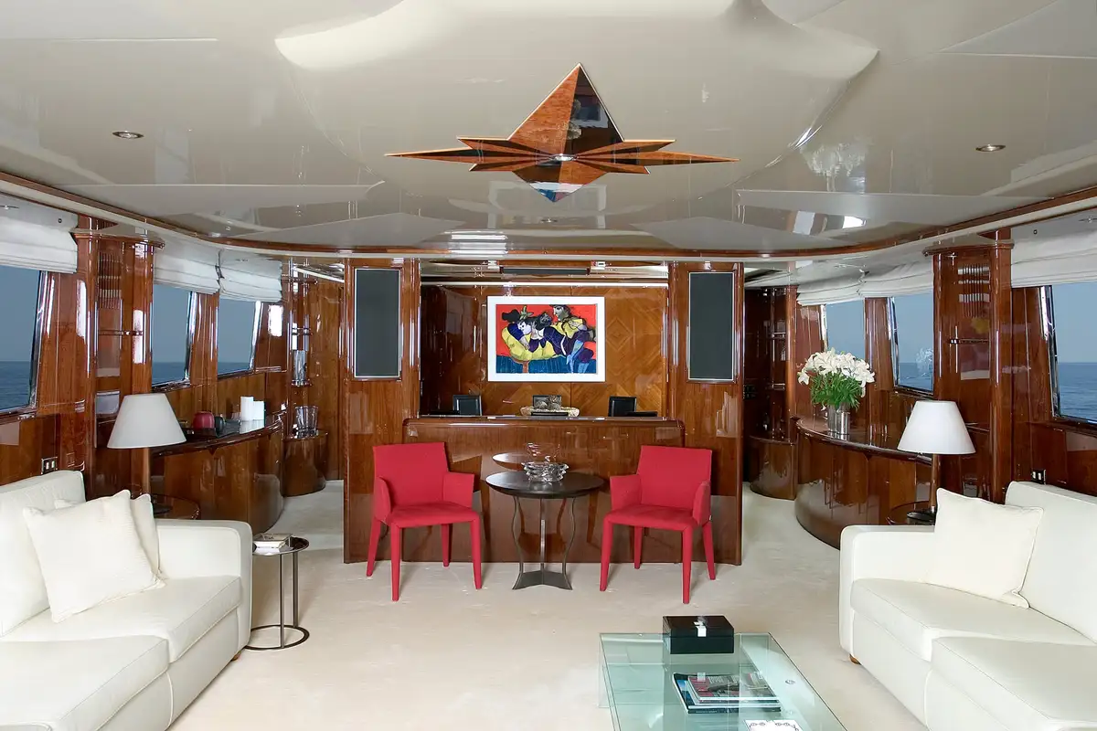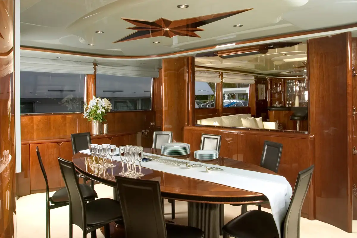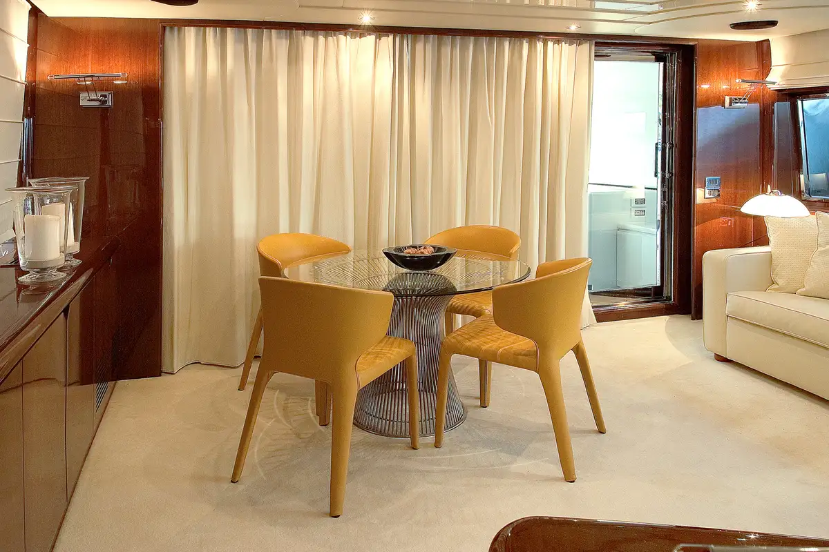 Her main deck lounge is a big, bright and open space with bar, lounge and dining areas. The dining room can be almost fully separated from the rest of the lounge. One level up, the skylounge is a cosy living room with a sofa, a games table and an office desk. Fully glazed sliding doors give easy access from here out onto the upper aft deck.