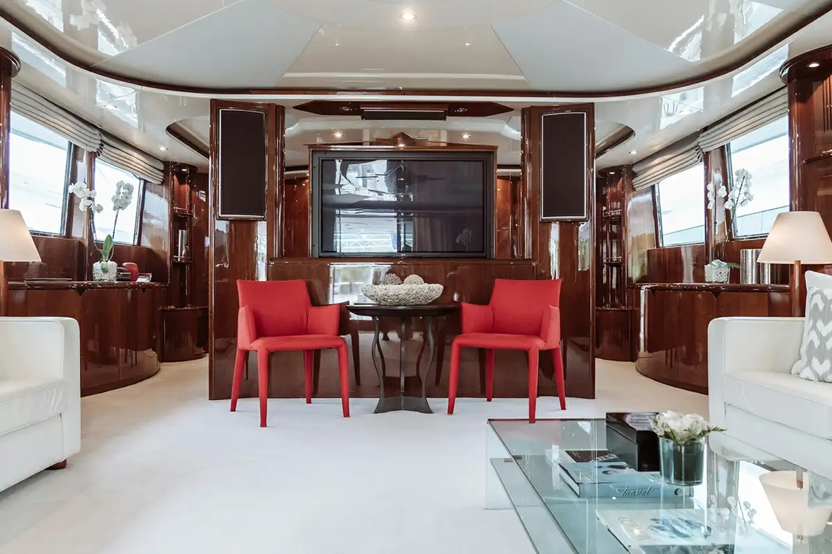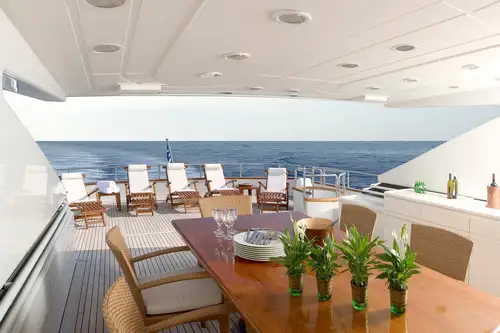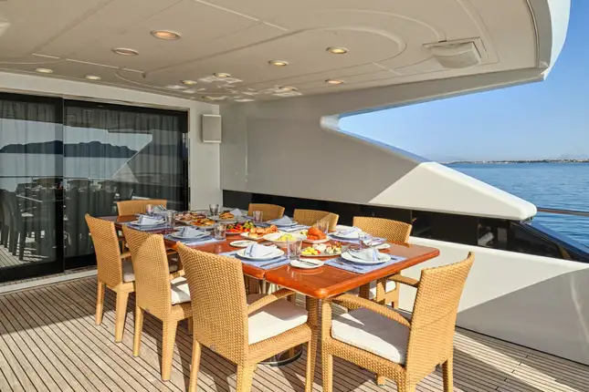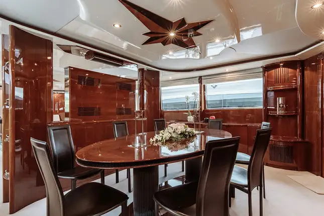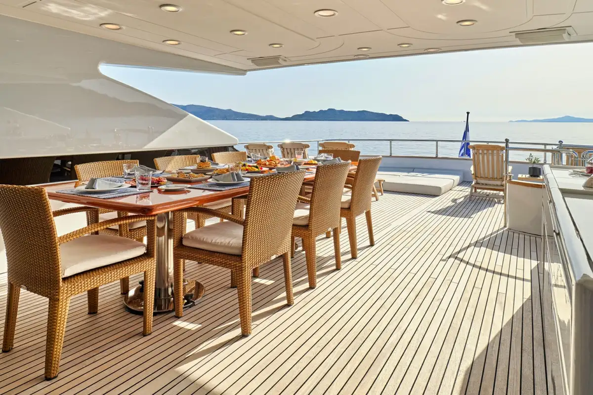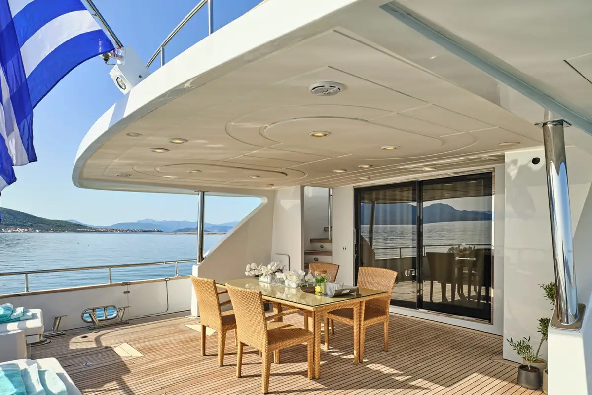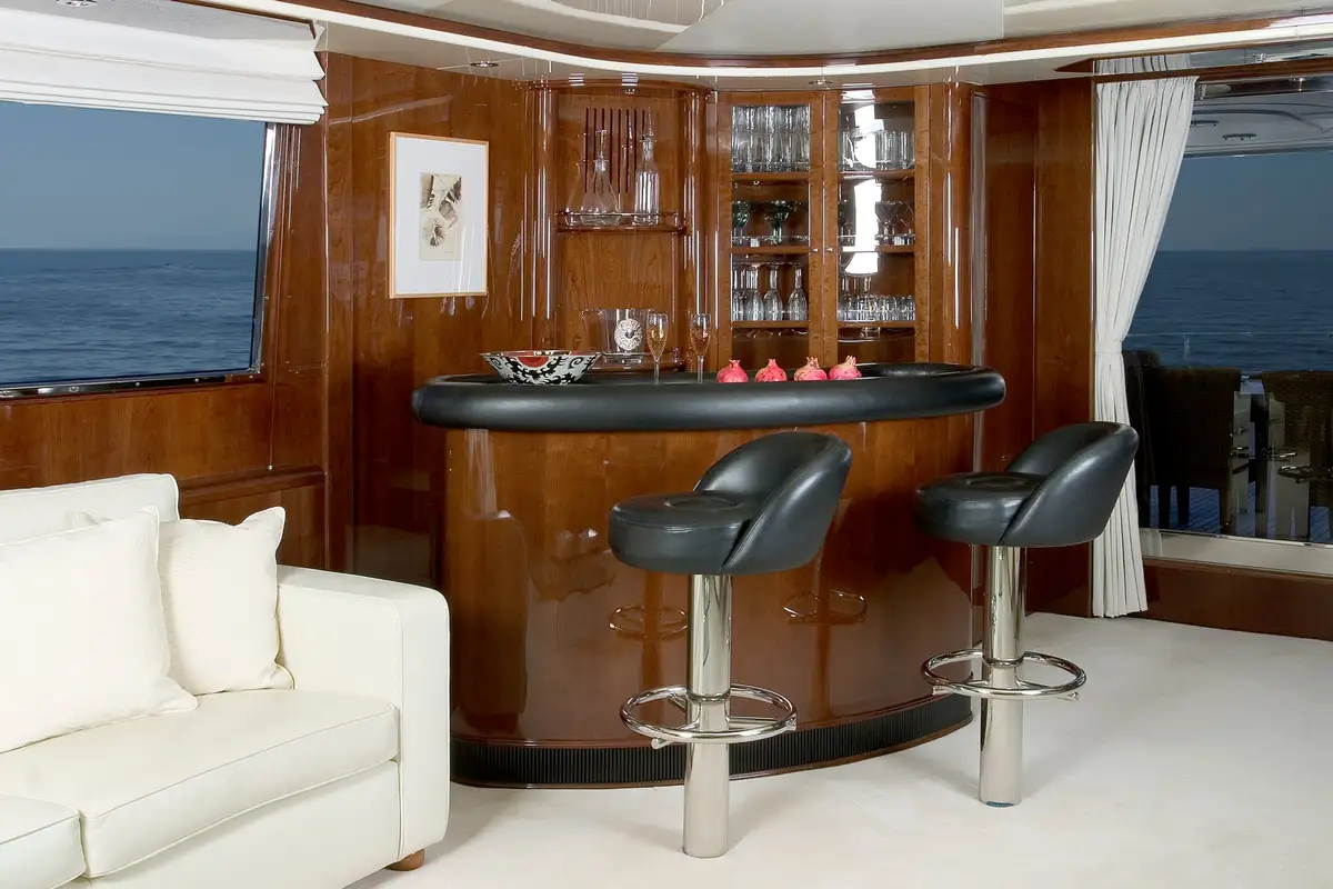 Her main deck lounge is a big, bright and open space with bar, lounge and dining areas. The dining room can be almost fully separated from the rest of the lounge. One level up, the skylounge is a cosy living room with a sofa, a games table and an office desk. Fully glazed sliding doors give easy access from here out onto the upper aft deck.