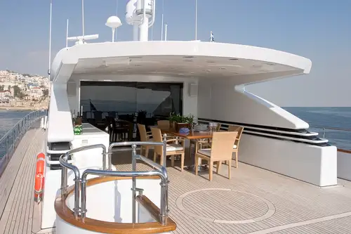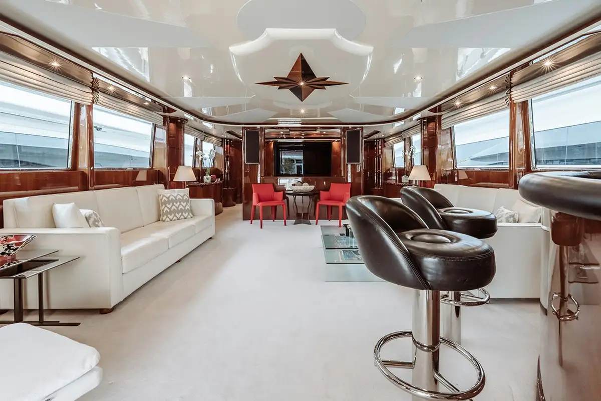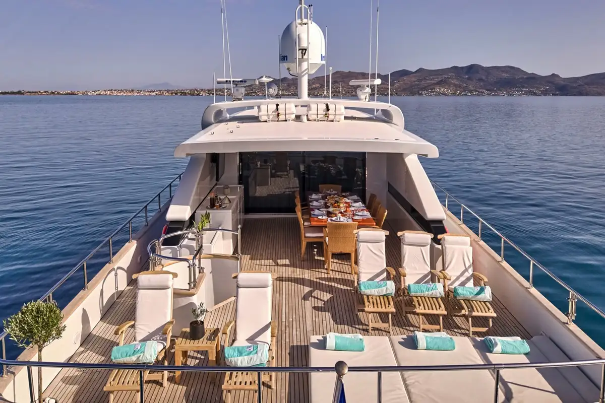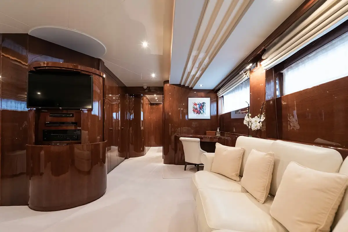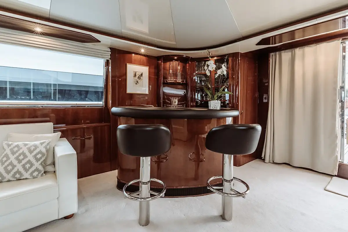 Her main deck lounge is a big, bright and open space with bar, lounge and dining areas. The dining room can be almost fully separated from the rest of the lounge. One level up, the skylounge is a cosy living room with a sofa, a games table and an office desk. Fully glazed sliding doors give easy access from here out onto the upper aft deck.