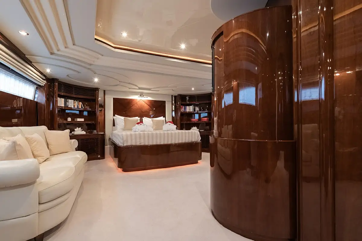 A private passageway leads forward from the main deck lobby to the full-beam master suite, which is an L-shaped cabin in the bow. Here you’ll have a study desk on the starboard side of the king size bed, plus a three-seat sofa and another desk to port. The en suite bathroom is nicely finished in high-gloss hardwood, marble and tile.
