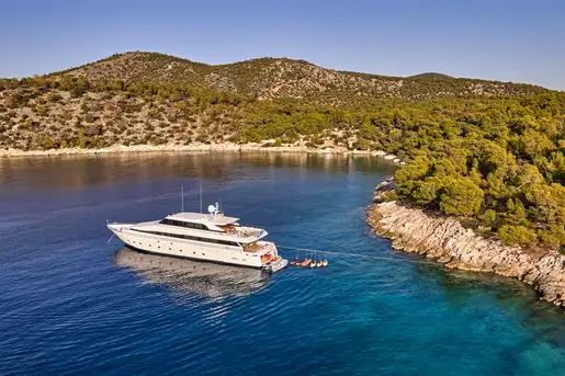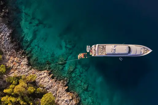 Key features and benefits include a wide variety of watersports toys, stabiliser fins to ensure a comfortable ride at sea, high-speed Starlink internet connectivity throughout the yacht, and service from a highly experienced crew of eight who have worked together as a team for many years.