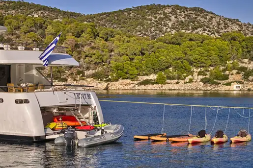Her inventory of small craft and toys includes two tenders, electric-powered paddleboards, waterskis for adults and kids, a wakeboard and an eFoil board, SeaBob underwater scooters, sea kayaks, inflatable tows and more.
