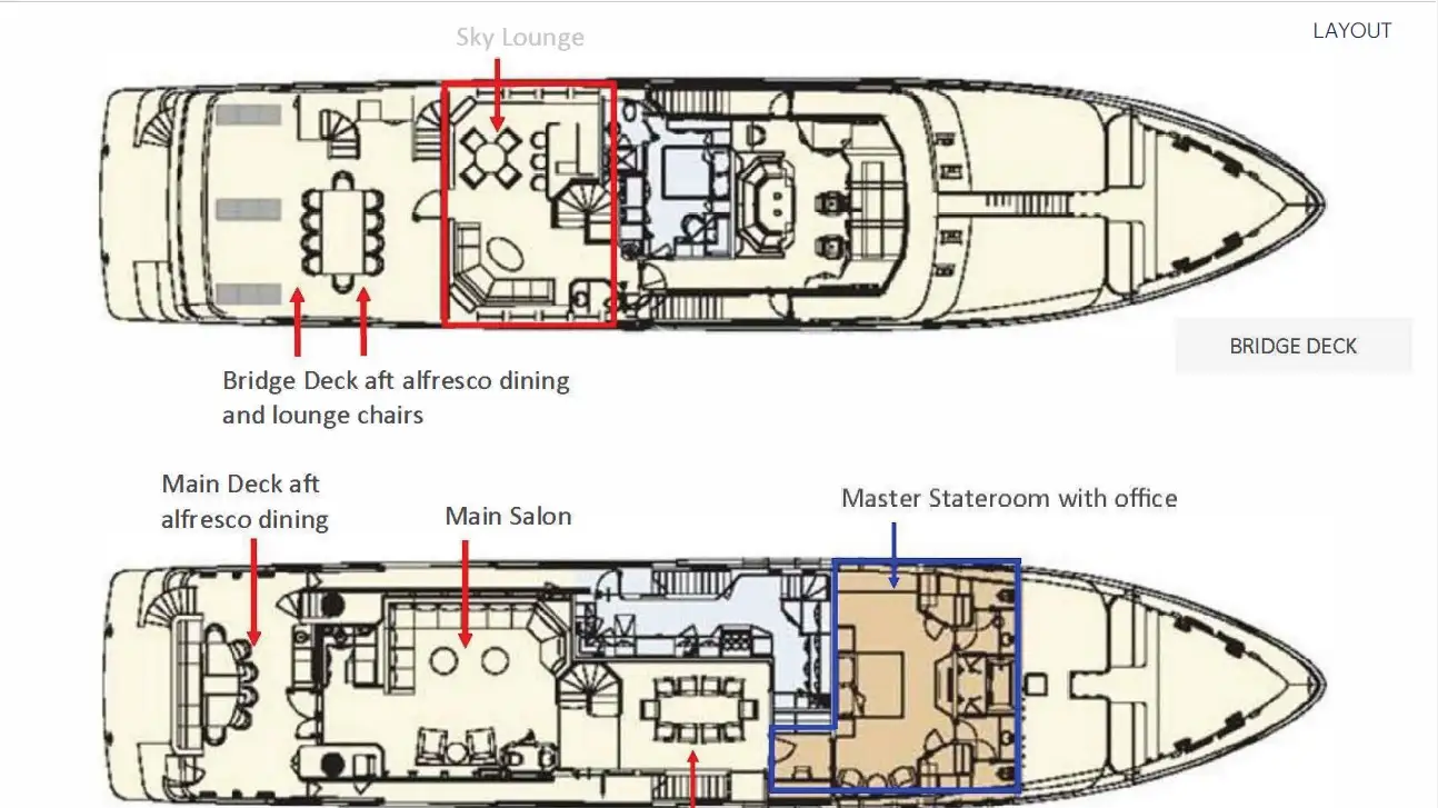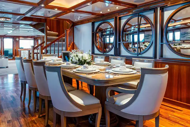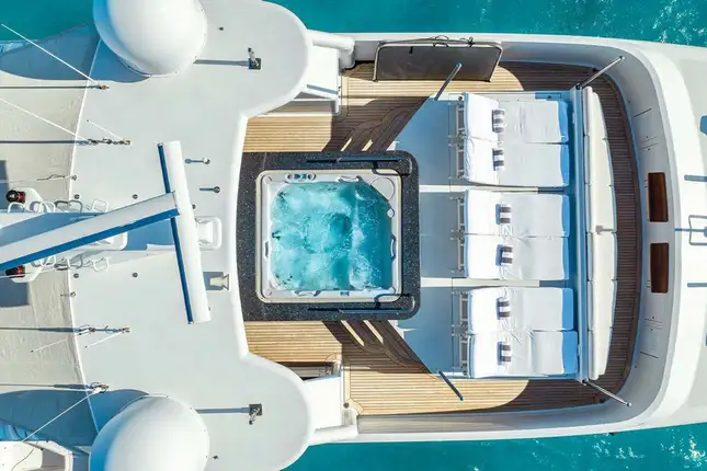 Exceptionally large for her length, this sleek 125-foot, tri-deck yacht offers the volume and space of a 150-footer. Among the abundance of indoor and outdoor spaces is the sun deck, with a spa pool, bar, and wicker settees. Also on this deck are over sized lounge chairs that adjust to face the sun or shade and can convert to sun pads. One level down, on the boat deck, there’s a large table for dining under the stars. Meals are also served on the main deck, either in the formal dining salon or in the soft breeze on the aft deck.