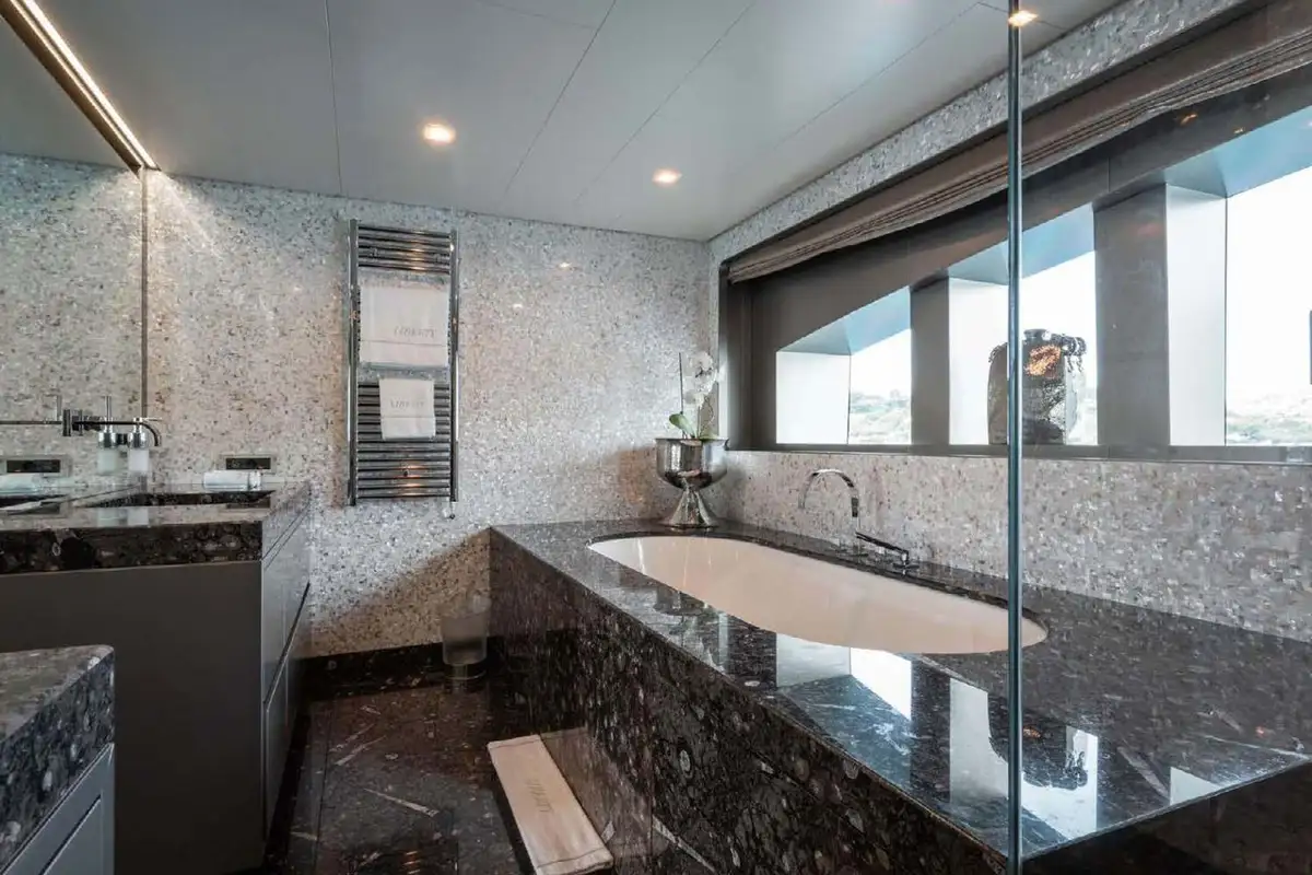 Depending on the size of your charter party, LIBERTY’s versatile deck areas have plenty of lounging areas for both large social gatherings, and smaller, more intimate occasions. Whether relaxing in the main deck saloon or sky lounge, or dining formally, her interior guest spaces are contemporary and welcoming. However, the al fresco deck areas are really the standout spaces on this yacht. Start the day with breakfast on the upper deck aft before heading up to the sun deck. Here you can sit back and relax on her various loungers and sun pads, or, for the best view of your surroundings, head to the sun lounging area forward of the bridge.