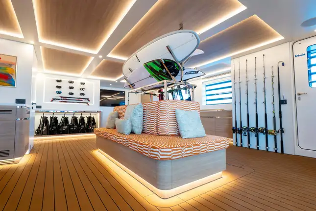 LIMERENCE boasts a cutting-edge dive centre, fully equipped for scuba diving, freediving, and spearfishing, with professional-grade gear and expert support to unlock the wonders beneath the waves. Her extensive water toy collection includes jetskis, jetsurfs, wakeboards, wakesurfs, Hobie Cats, a Laser dinghy, kayaks, paddleboards, SeaBobs, kite surfing gear, and even zorb balls. These are supported by a remarkable four luxurious tenders, including a stylish 11m (38ft) Wajer 38S tender, a 12.5m (41ft) Xtender chase boat, and a fully outfitted wake boat.