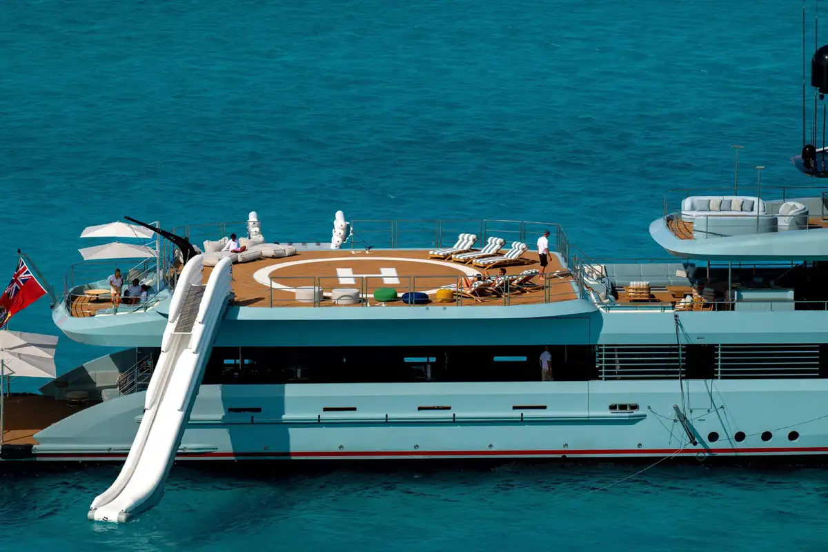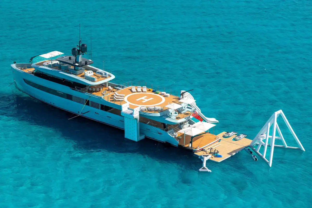 The expansive swim platform serves as a launchpad for fun, where a floating inflatable adventure park extends into the sea. Complete with a waterslide, trapeze swing, climbing wall, gladiator podiums, and dedicated jetski docks, the set-up promises boundless excitement for guests of all ages.