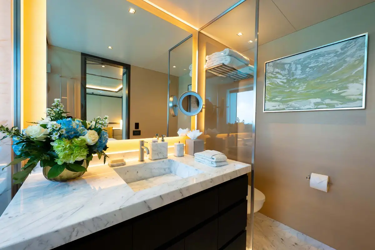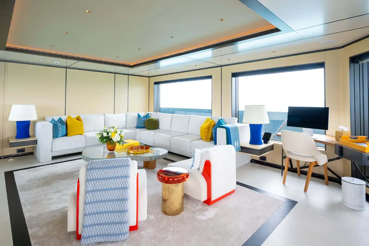 The sun deck invites guests to unwind in style, offering panoramic views, a jacuzzi, sun loungers, and a bar area perfect for cocktails at sunset. Meanwhile, the sky lounge combines contemporary elegance with comfort, ideal for socialising or simply relaxing in air-conditioned luxury.